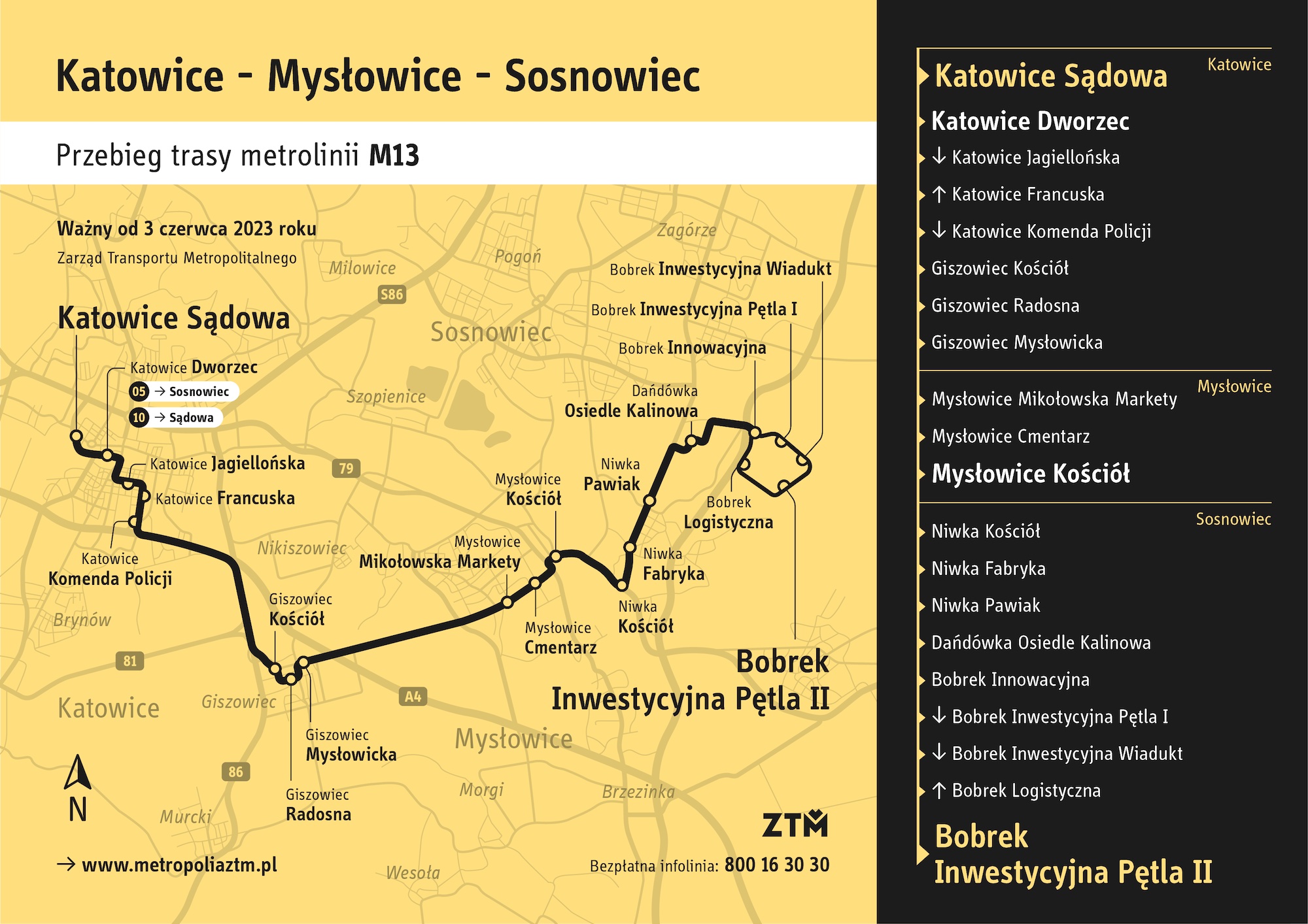 Uruchomienie linii M13 zapewni zwiększoną obsługę Strefy Ekonomicznej w Sosnowcu, co ułatwi dojazdy i powroty z pracy mieszkańców Katowic i Mysłowic. Nowe połączenie umożliwi także szybkie przemieszczanie się pomiędzy Sosnowcem a centrum Katowic, przez katowicką dzielnicę Giszowiec i Mysłowice, a także usprawni podróże między sosnowieckimi dzielnicami Niwka, Dańdówka i Bobrek. Linia kursować będzie z częstotliwością co 30 minut w dni robocze oraz co 60 minut w dni wolne.