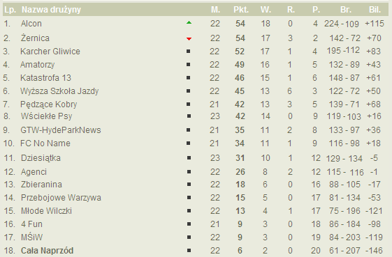 W tym sezonie na parkiecie mamy szansę oglądać aż 18 drużyn, które pojawiają się co niedzielę na hali aby pomóc i dobrze się przy tym bawić, aktywnie spędzając czas. Alcon to pierwszoligowa drużyna broniąca tytułu Mistrza NLF. W tym sezonie również udaje im się utrzymać pozycję lidera, choć Żernica jest dla nich dużym zagrożeniem. Amatorzy to nowy zespół, który swoich przeciwników próbował zwieść nazwą. Teraz już wiemy, że amatorami wcale nie są i nie poddają się w walce z najlepszymi. Żernicę mamy okazję oglądać również na dużym boisku, a na parkiecie wciąż udaje jej się bronić miejsca w czołówce. Karcher Gliwice to rywal, na którego nikt nie chce trafić, ponieważ były wicemistrz ligi rzadko kiedy schodzi poniżej dwucyfrowej liczby zdobytych bramek. Wyższej Szkole Jazdy wciąż udaje się utrzymywać na górze tabeli. Czy chłopaki nauczą rywali jak się gra? Katastrofa 13 to drużyna, której od samego początku wiernie dopingują trzy pokolenia kibiców. Wściekłe Psy, zespół bardzo zorganizowany w zeszłym sezonie grał w III lidze, a w tym postanowił pomóc Ani Urban grając w Niedzielnej co bardzo nas cieszy. Pędzące Kobry mieliśmy okazję dobrze poznać w pierwszej edycji rozgrywek, gdzie zdobyły tytuł „Najlepiej zorganizowanej drużyny”. FC No Name, drużyna wojskowych w zeszłym sezonie walczyła o tytuł mistrza, a tym razem na pozycji w środku tabeli. Czy żołnierze odzyskają formę przed końcem rozgrywek? W GTW-HydeParkNews często oglądamy młodych adeptów futsalowej szkółki GTW. Za to w Agentach panowie w sile wieku pokazują młodym jak się gra. Dziesiątka to jedna z nowych drużyn, której pozycja w środku tabeli jest dosyć stabilna. Zbieranina – Czarny Koń naszych rozgrywek, ostatnio pokazuje na co ją stać i że miejsce w końcówce tabeli wcale chłopaków nie zadowala. Przebojowe Warzywa mieliśmy okazję gościć w lidze już w zeszłym sezonie, ale pod inną nazwą. Podobno są warzywami sezonowymi, które dojrzewają dopiero na rundę rewanżową. 4 Fun to zespół, który jak sama nazwa wskazuje gra dla zabawy i nie przejmuje się wynikami. Młode Wilczki mogliśmy poznać dopiero na początku drugiej rundy, kiedy to zastąpiły drużynę NN niewywiązującą się ze swoich finansowych zobowiązań. U chłopaków wciąż jeszcze widoczny jest brak ogrania, ale są pełni zapału i chęci do gry. Ministerstwo Śledzia i Wódki ma bardzo duże aspirację, ale niestety rzadko udaje im się przerwać złą passę porażek. Całej Naprzód – drużyny organizatora, nie trzeba wcale przedstawiać. Chłopaki dzielnie chronią tyły w tabeli i dobrze wiedzą jak przegrywać z uśmiechem.