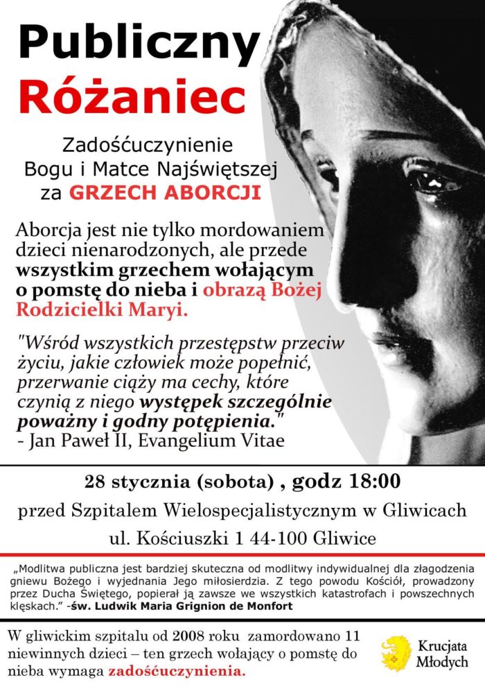 W najbliższą sobotę, 28 stycznia o godz. 18.00, przed Szpitalem Wielospecjalistycznym przy ul. Kościuszki 1 odbędzie się pikieta połączoną z różańcem ekspiacyjnym.