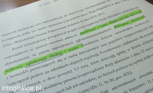 Warto podkreślić, że przygotowano nawet projekt rozporządzenia Rady Ministrów, w którym przewidywano zwolnienie z opłat odcinków autostrad zlokalizowanych w największych aglomeracjach to jest: Warszawy, Wrocławia, Krakowa, Łodzi i Górnego Śląska.