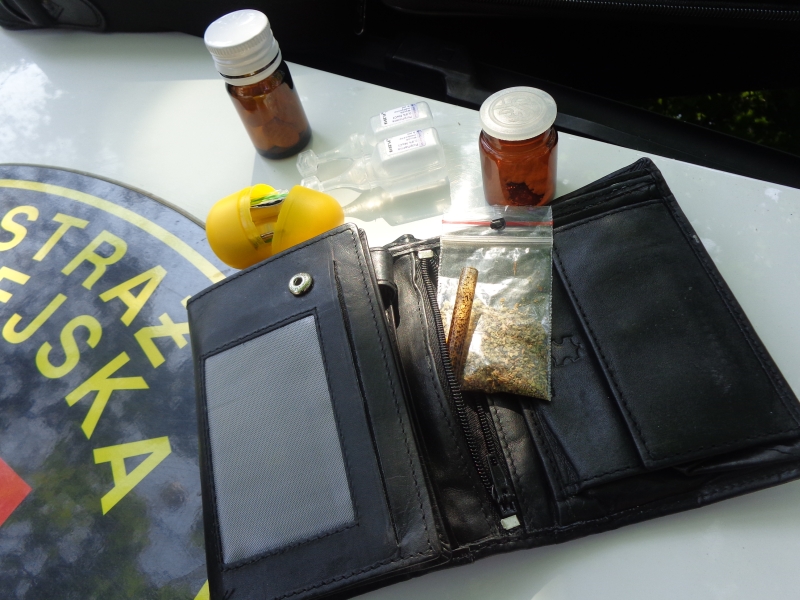 Podczas legitymowania z portfela mężczyzny wypadł na ziemię woreczek z substancją przypominającą marihuanę. Natomiast przy torbie należącej do mężczyzny zauważono buteleczkę, w której znajdował się biały proszek. Na miejsce wezwano więc również policję.