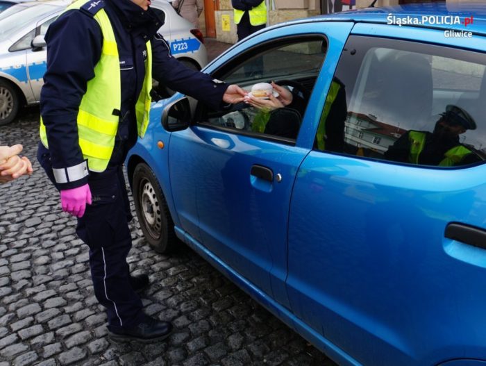 Tych kierujących, którzy przestrzegali zasad ruchu i reagowali prawidłowo, zachowując ostrożność oraz przepuszczając pieszych, funkcjonariusze prosili o zjechanie na bok. Co oczywiste, prowadzący samochody byli zaskoczeni, a nawet nieco zaniepokojeni, bowiem nie złamali przepisów… Szybo przekonywali się jednak, że czekała ich tylko miła niespodzianka – za dobre zachowanie za kółkiem otrzymywali pączki.