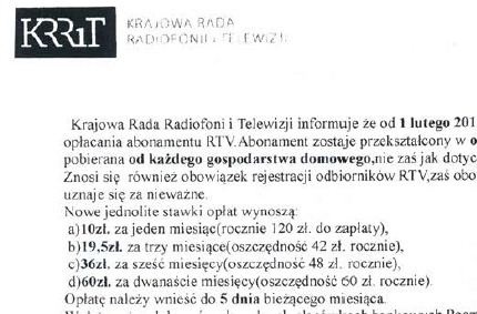 Krajowa Rada Radiofonii i Telewizji (KRRiT) opublikowała komunikat, że pojawiają się przypadki otrzymywania przez posiadaczy odbiorników RTV, pisma oznaczonego logiem KRRiT wzywającego do zapłaty – rzekomo nowych – opłat abonamentowych. W piśmie również zostało wskazane, że zniesiony został obowiązek rejestracji odbiorników radiowych i telewizyjnych, co również jest nieprawdziwą informacją. Obowiązek płatności abonamentu oraz rejestracji takich urządzeń, obowiązują niezmiennie od kwietnia 2005 r.