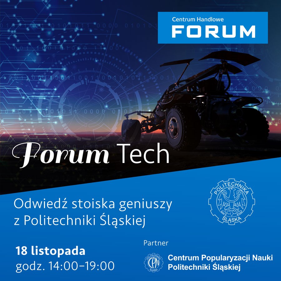 CH FORUM, Centrum Popularyzacji Nauki Politechniki Śląskiej oraz zaawansowane technologie. Efektem tego połączenia jest impreza FORUM Tech (sobota, 18 listopada; godz. 14:00 – 19:00). Ucieszy ona zwłaszcza fanów nowych technologii oraz miłośników naukowych nowinek.