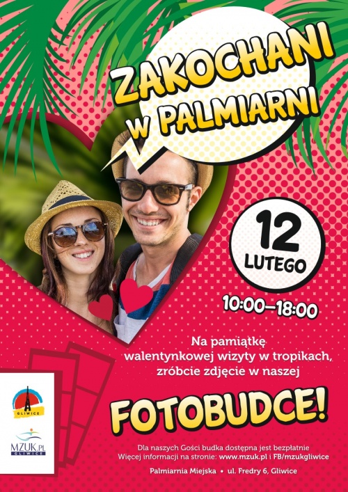 Gliwickie tropiki to miejsce, które nie raz było świadkiem romantycznyc chwil, jak np. zaręczyny. – Palmiarnia często wykorzystywana jest jako plener do zdjęć ślubnych. Tym razem proponujemy naszym gościom uwiecznienie swych uczuć z lekkim przymróżeniem oka. – mówi Barbara Trzebińska, zastępca kierownika Palmiarni. 12 lutego fotobudka będzie dostępna dla naszych gości za darmo w godzinach pracy Palmiarni (10:00 – 18:00).