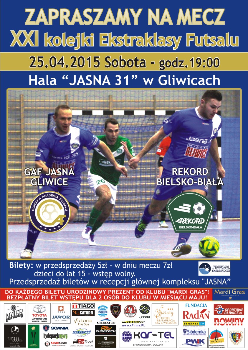 Mecz GAF Jasna Gliwice – Rekord Bielsko-Biała odbędzie się w najbliższą sobotę, 25 kwietnia na hali JASNA 31.