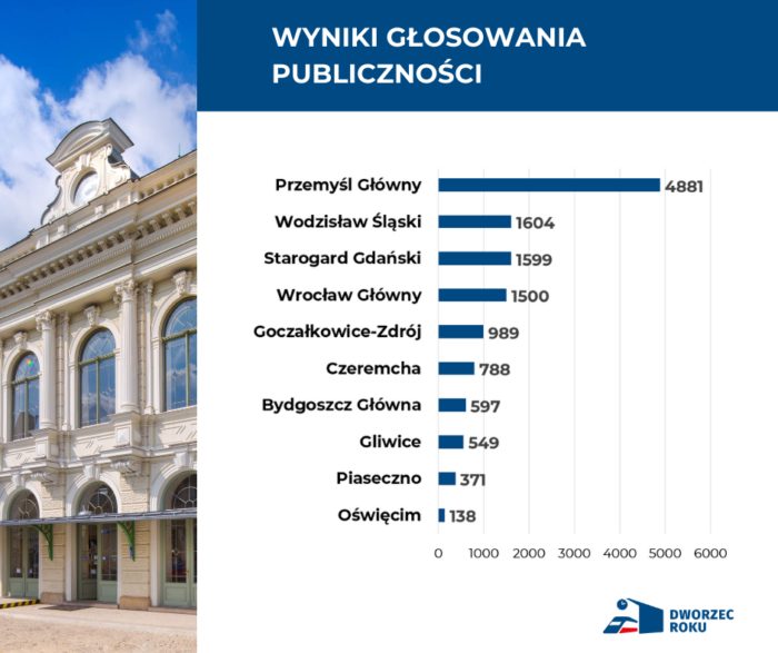 Tak wyglądały ostateczne wyniki głosowania publiczności w tegorocznej edycji konkursu „Dworzec Roku”. Przemyśl Główny wygrał z olbrzymią przewagą, ale walka o drugie miejsce toczyła się do ostatniej minuty. To kolejny rok z rzędu, w którym to wysoką pozycję zajął Wodzisław Śląski. Wrocław Główny w tym roku znalazł się tuż poza podium, wyprzedził go Starogard Gdański.