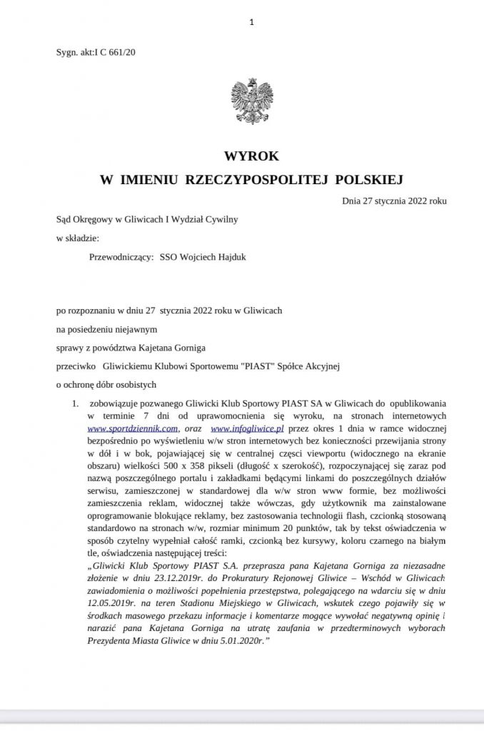 Aktualizacja: Kajetan Gornig poinformował, że pozwał Piasta Gliwice w związku z tą sprawą. 11 lutego 2022 roku zamieścił w internecie wyrok
