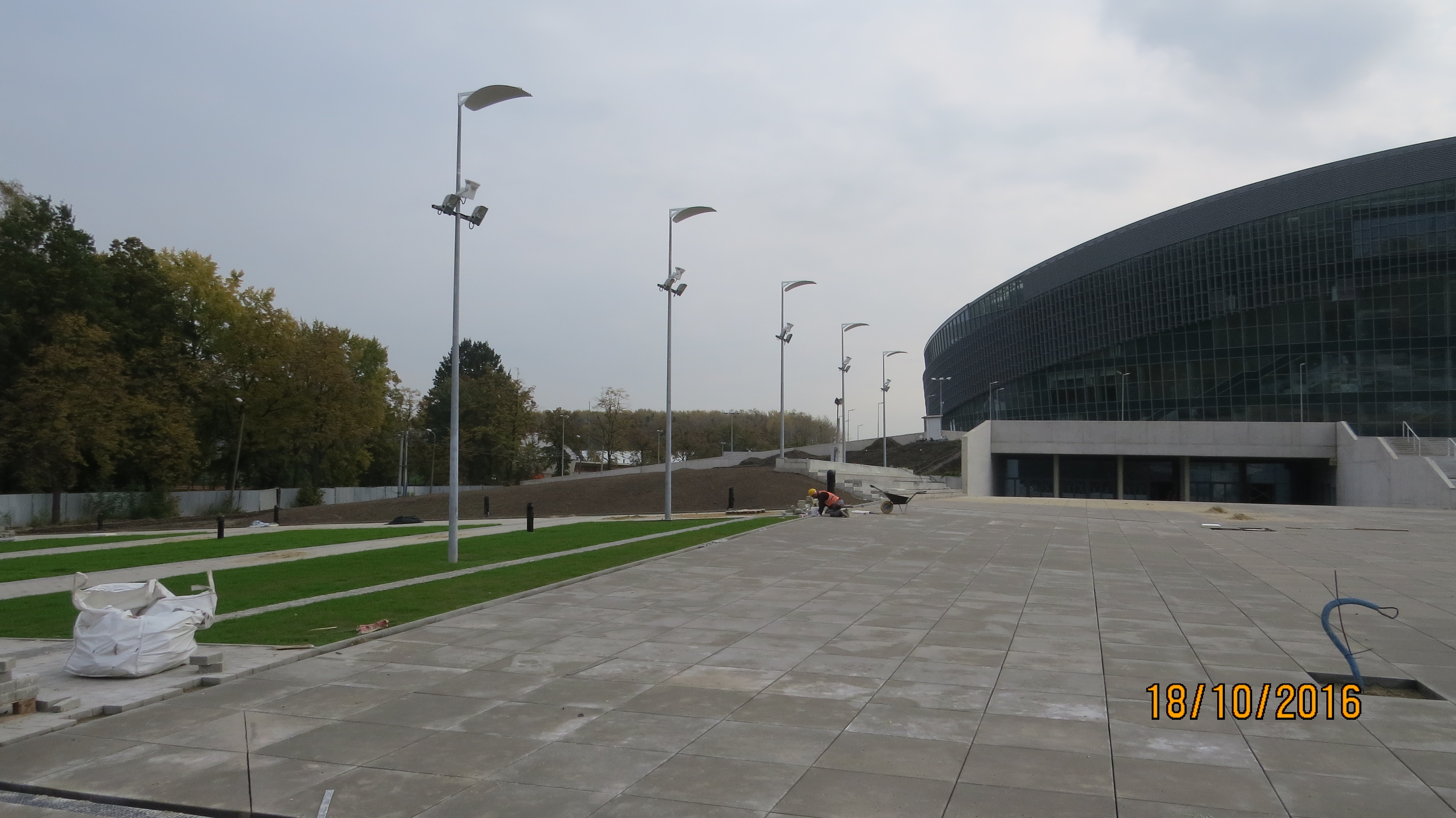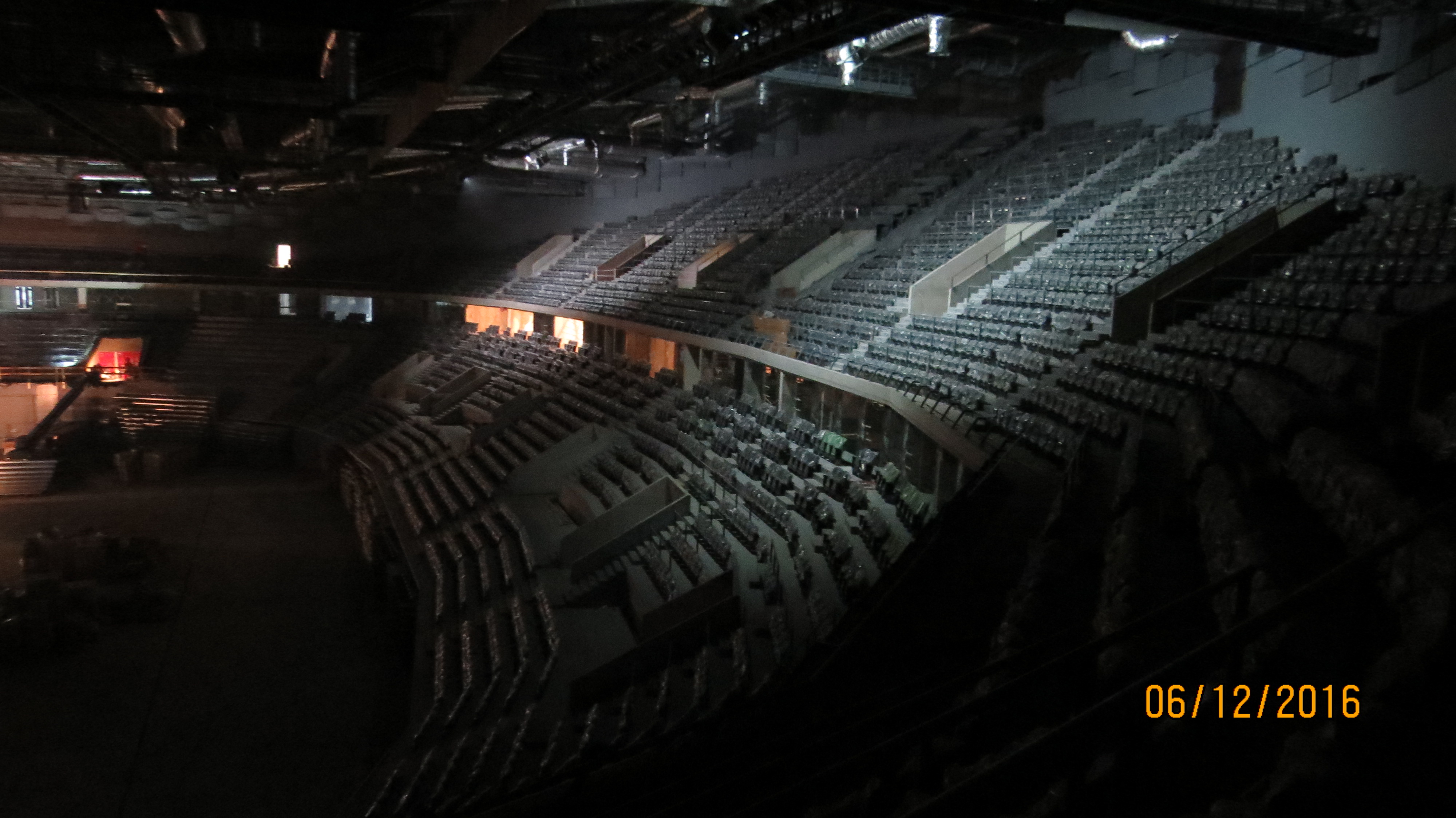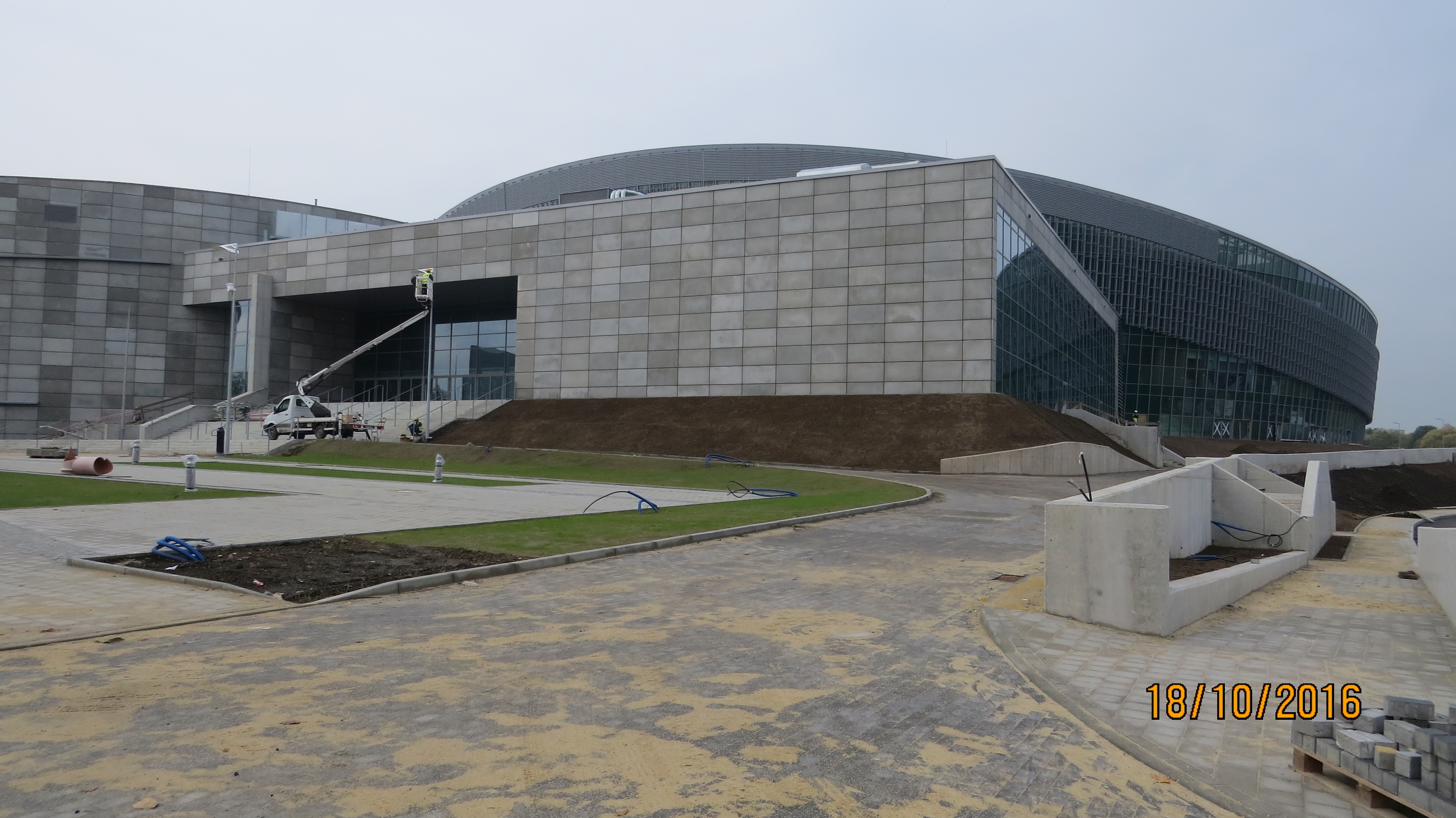 Na arenie hali głównej dobiegają końca prace związane z montażem trybun mobilnych. Na trybunach stałych montowane są krzesełka oraz balustrady.