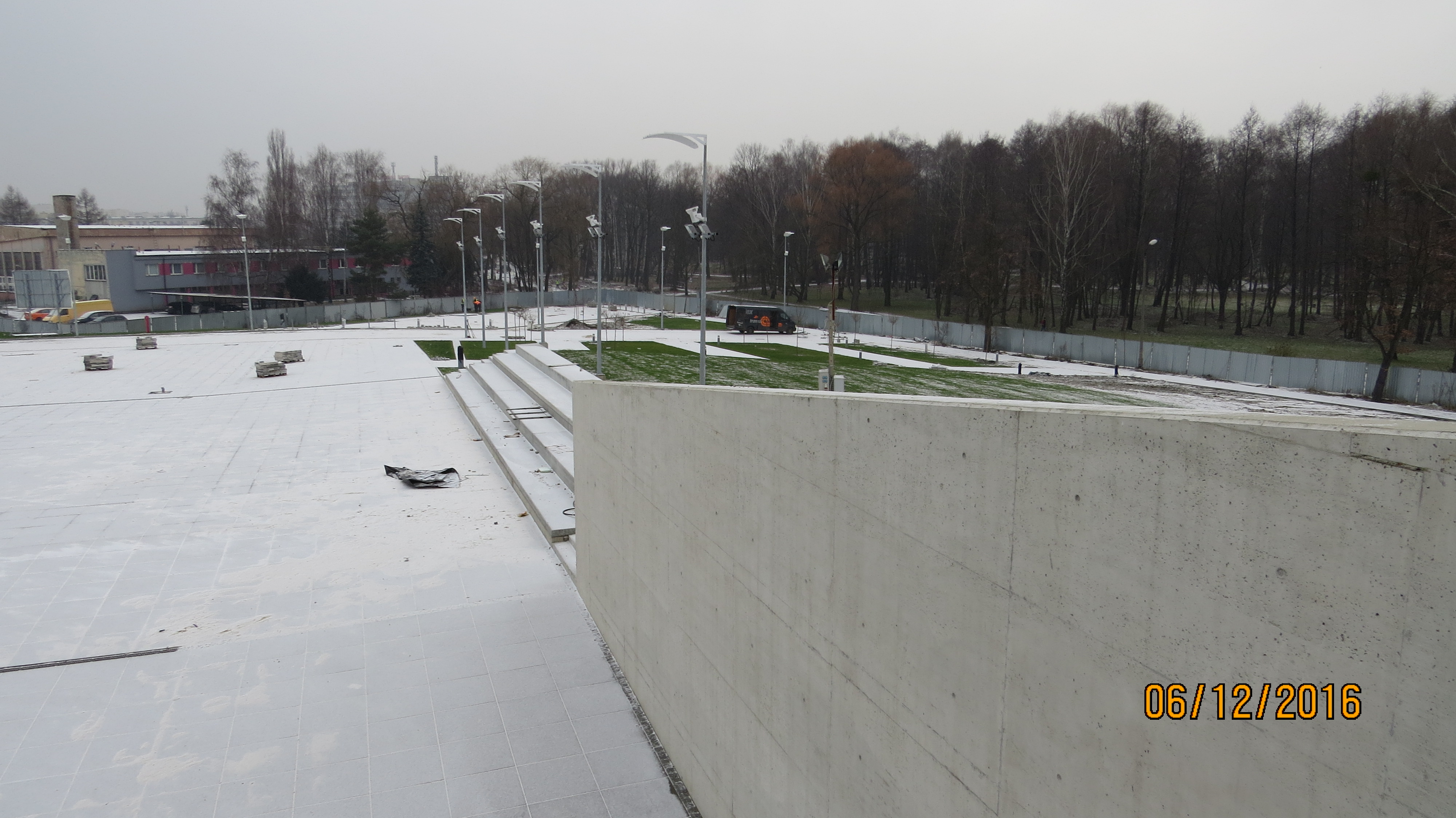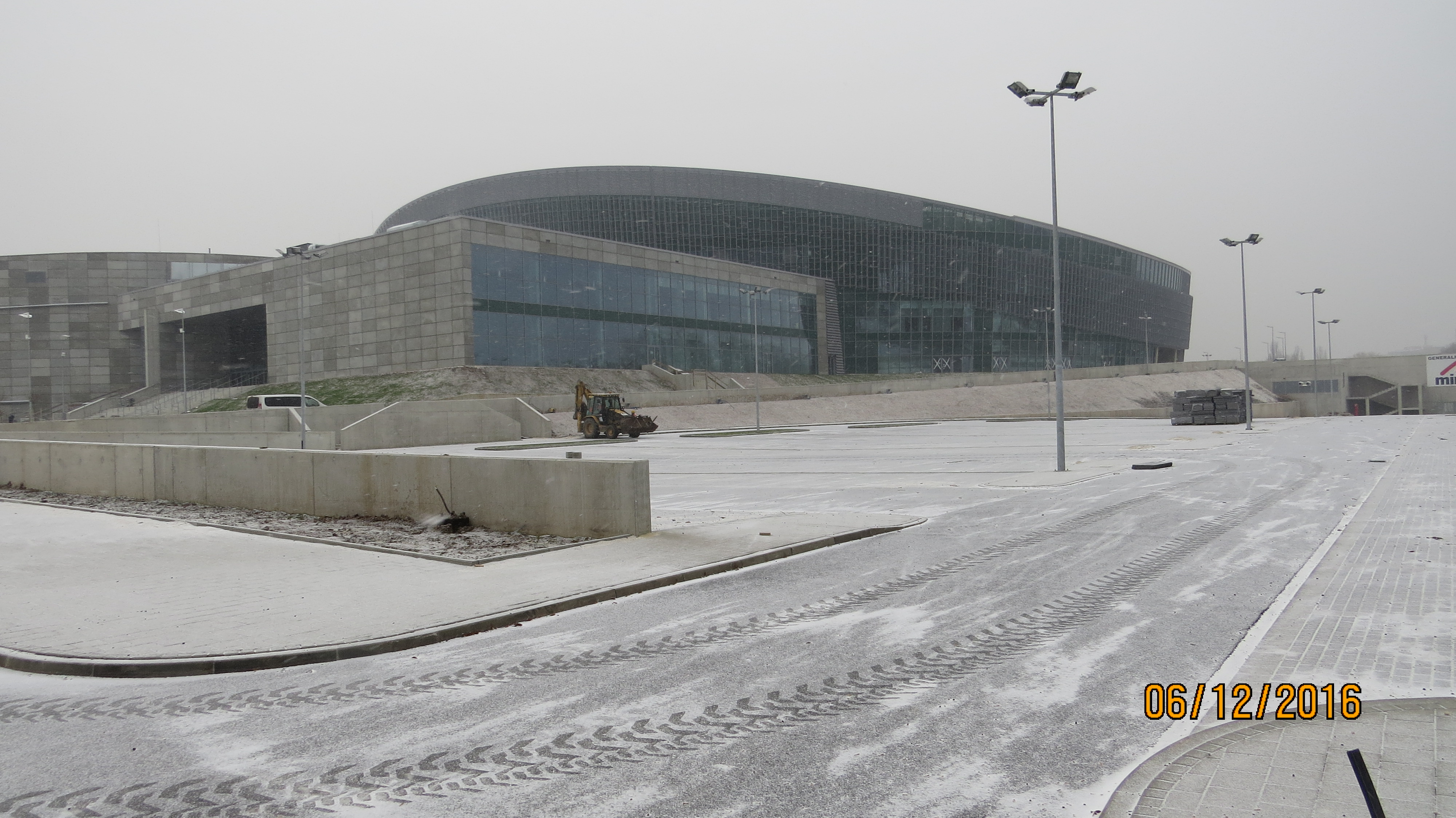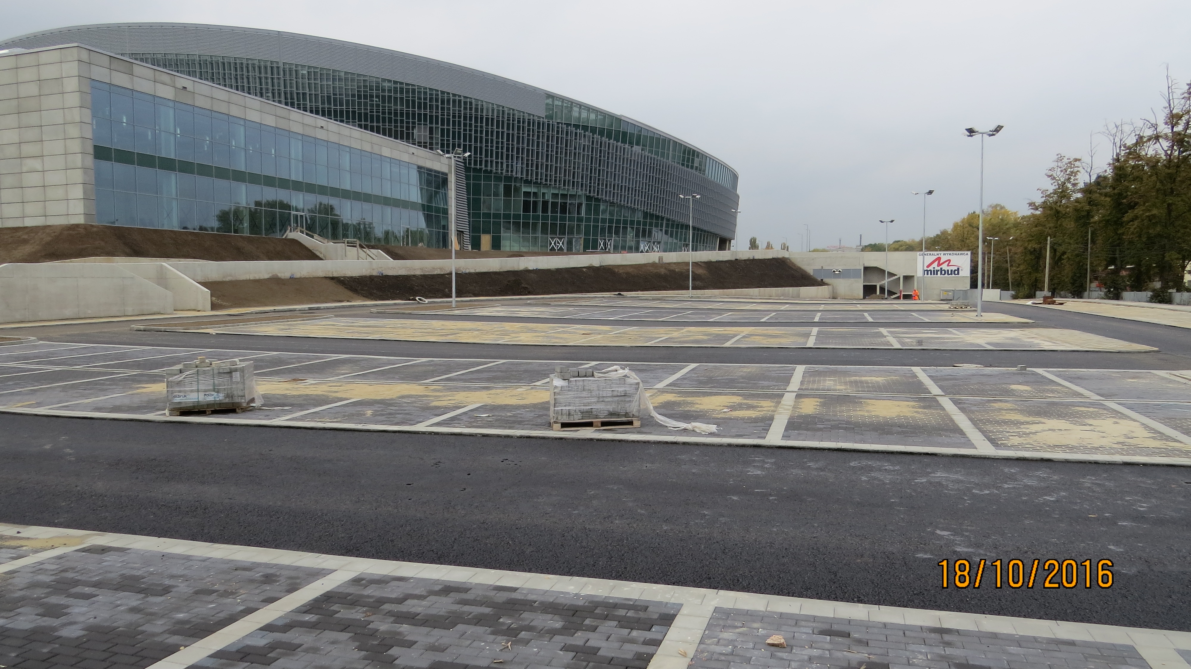 – Wokół hali na drogach zewnętrznych zakończono układanie asfaltu. Finalizowane są prace związane z wykończeniem pozostałych nawierzchni placów i chodników. Trwa montaż oświetlenia zewnętrznego – większość już jest wykonana, prowadzony jest montaż urządzeń technicznych m. in. szlabany, ogrodzenie terenu, bramy podaje – Tomasz Kaźmierczak – Kierownik Budowy Generalnego Wykonawcy Firmy Mirbud S.A