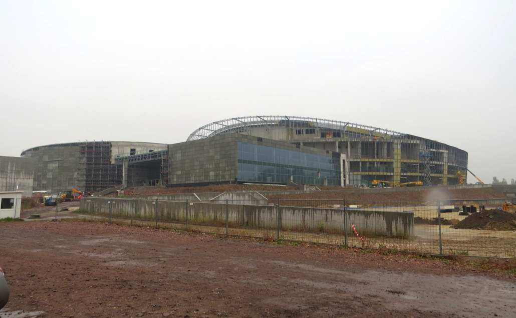 Dach hali, żelbetowy ring z 58 stalowymi splotami linowymi o łącznej długości 150 km i trapezową blachą, został wsparty 40 słupami. Dobiegają końca prace przy obudowie części treningowej. Są zaawansowane w 80 procentach. Elewacja mniejszego budynku jest wykonana w ponad 90 procentach.