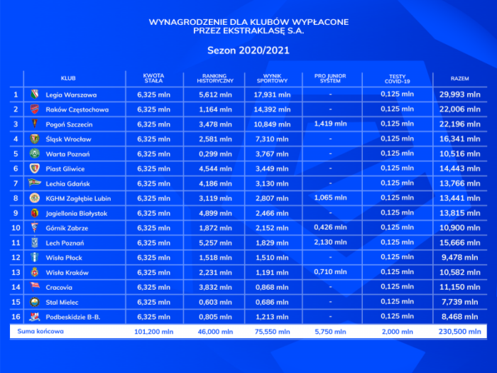 Gra była o naprawdę dużą stawkę. Ekstraklasa, spółka zarządzająca rozgrywkami i pozyskująca przychody dla ligi, wypłaci klubom za sezon 2020/21 łącznie 230,5 mln zł. Na koniec sezonu 2020/21 na szczycie finansowej tabeli Ekstraklasy, analogicznie do klasyfikacji sportowej, uplasowała się Legia Warszawa – do jej kasy trafi blisko 30 mln zł. Za nią znalazły się Raków Częstochowa i Pogoń Szczecin z przelewami na ponad 22 mln zł każdy.