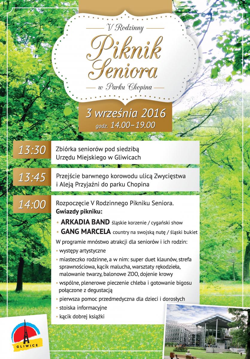 W sobotę, 3 września, w parku Chopina będą się bawić gliwiccy seniorzy wraz z rodzinami. Atrakcji nie zabraknie. Impreza rozpocznie się o godz. 13.30 zbiórką przed Urzędem Miejskim w Gliwicach. O godz. 13.45 barwny korowód przejdzie ul. Zwycięstwa i aleją Przyjaźni do parku Chopina. Tam o godz. 14.00 rozpocznie się piknik. Wystąpi Arkadia Band oraz Gang Marcela, ale nie zabraknie też innych atrakcji, m.in. wspólnego pieczenia chleba i gotowania bigosu, a zatem również degustacji. Poza tym przygotowano m.in. występy artystyczne, rodzinne miasteczko, dojenie krowy, balonowe zoo i kącik dobrej książki. Organizatorem wydarzenia jest Miasto Gliwice.