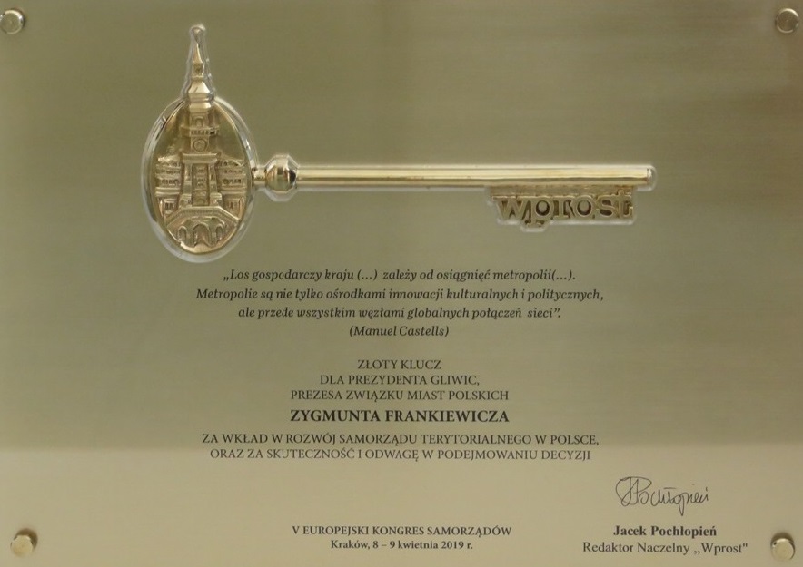 Złotym Kluczem redakcja tygodnika Wprost honoruje włodarzy, którzy mają szczególne, istotne dla społeczności lokalnej i nowatorskie osiągnięcia w sferze polityki gospodarczej, społecznej, kulturalnej oraz edukacyjnej. Zygmunt Frankiewicz został wyróżniony za szczególny wkład w rozwój samorządu terytorialnego w Polsce oraz skuteczność i odwagę w podejmowaniu decyzji. Nagrody zostały wręczone podczas V Europejskiego Kongresu Samorządów, który odbył się w Krakowie.