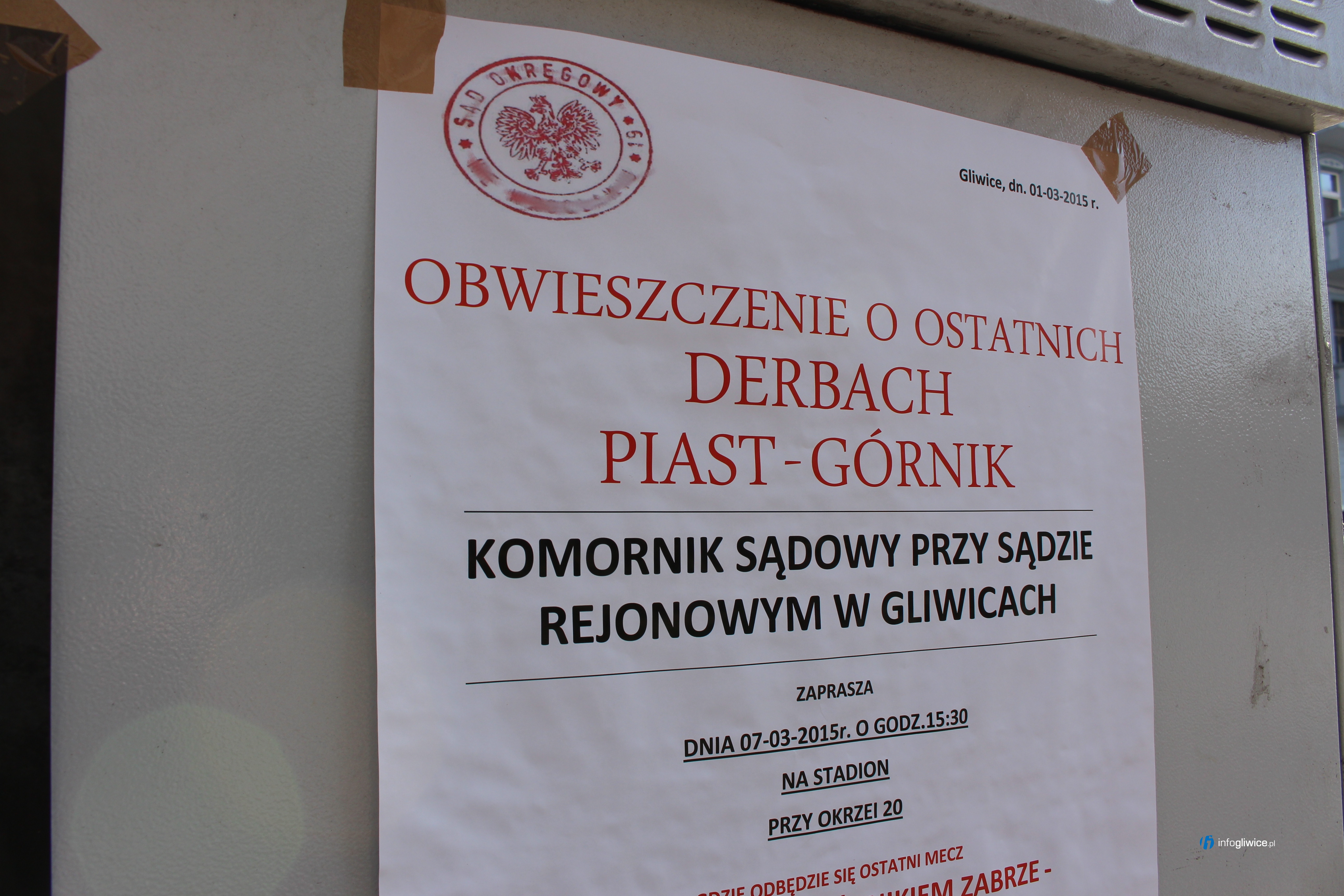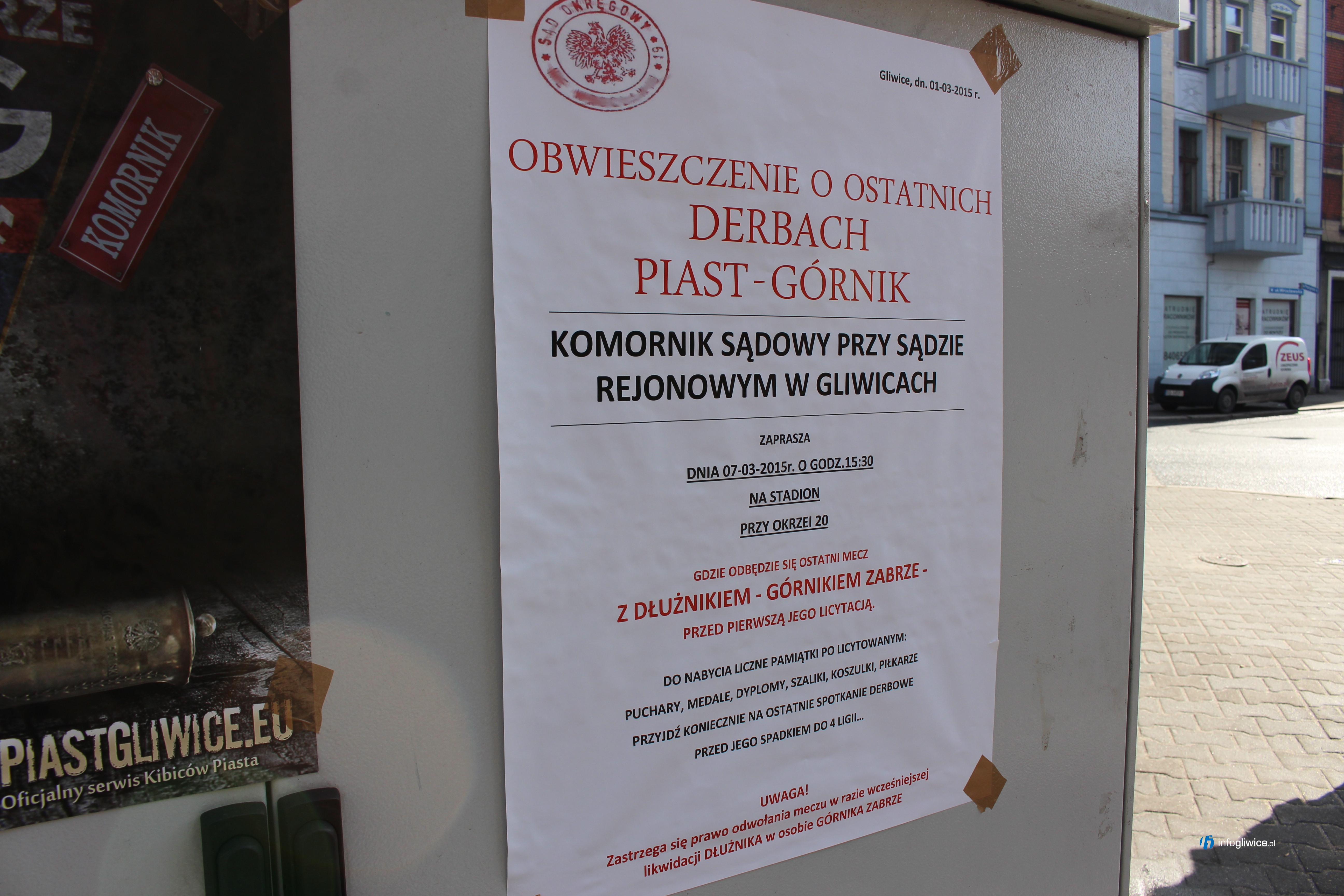 W wielu punktach Gliwic pojawiły się w nocy obwieszczenia, na których widnieje taka informacja: „Komornik sądowy przy sądzie rejonowym w Gliwicach zaprasza na ostatni mecz z dłużnikiem Górnikiem Zabrze”.