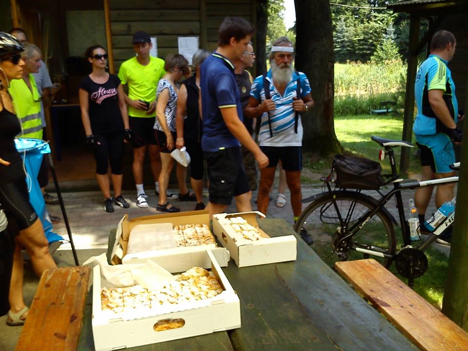 Po zwiedzaniu najciekawszych miejsc gminy, wójt przekazał zmęczonym rowerzystom poczęstunek – ciasto, zimną wodę oraz kawę i herbatę. Była to doskonała okazja, by w otoczeniu fontann odpocząć po długiej trasie.
