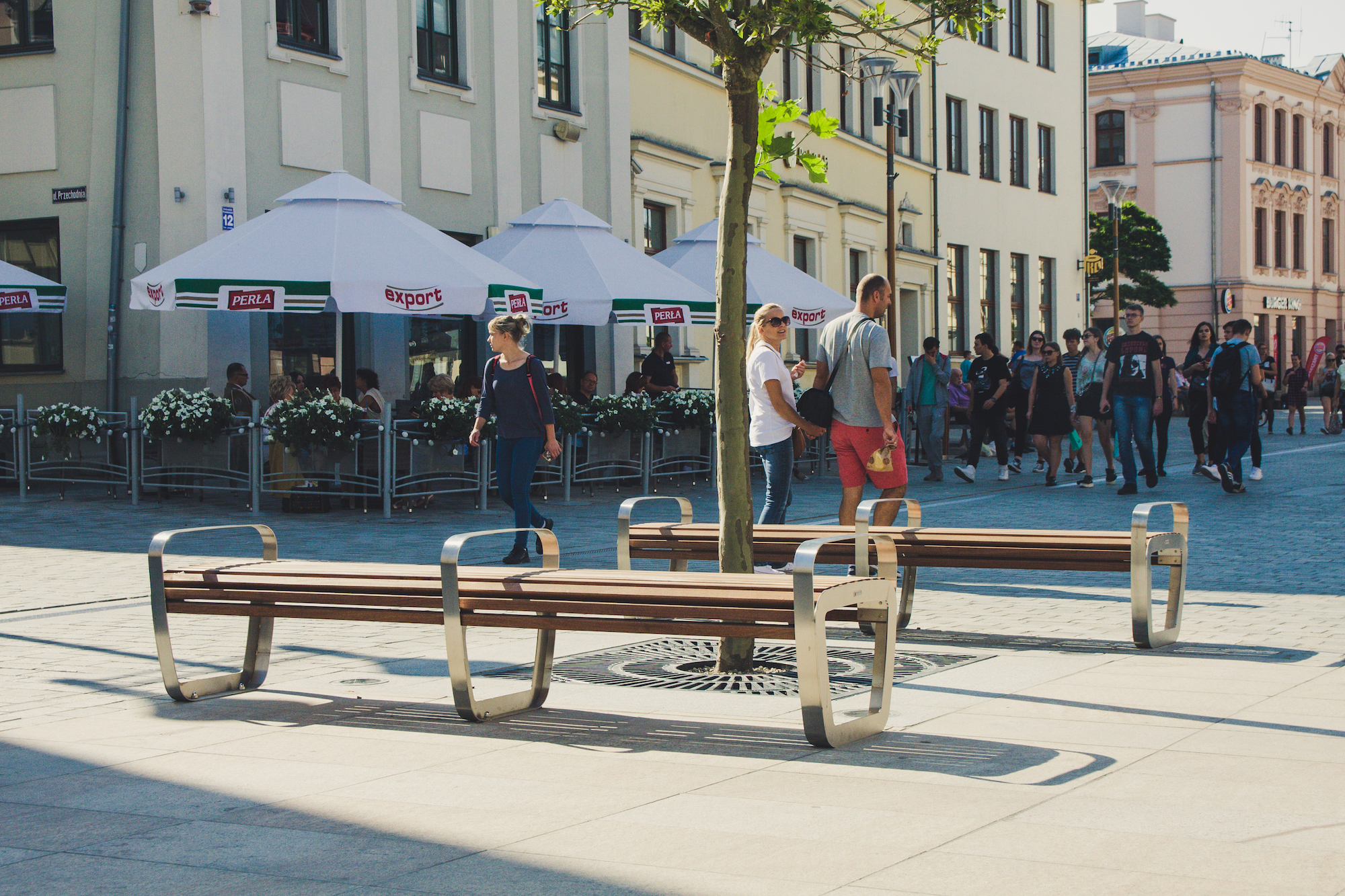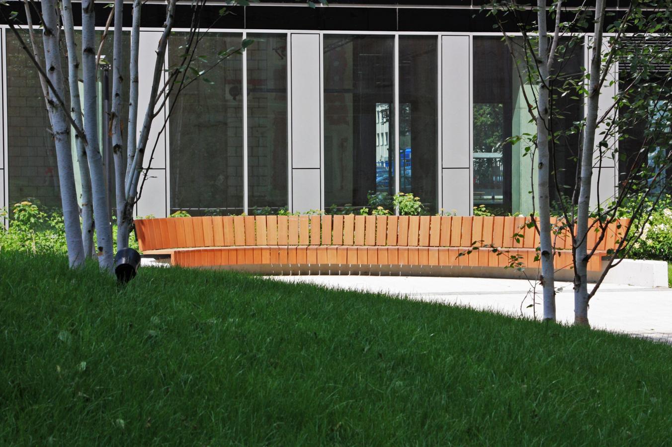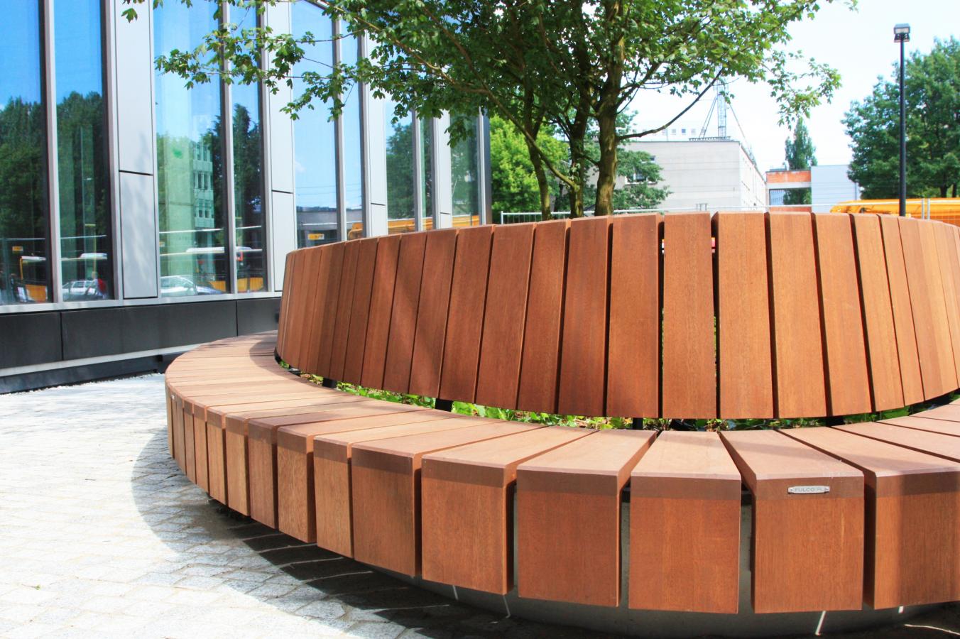 Elementy małej architektury pierwotnie miały być wykonane z drewna dębowego, które z uwagi na warunki fizyczne nie jest zalecane do zastosowania w przestrzeni publicznej. Dostarczone elementy wykonane zostały z lepszego gatunkowo drewna egzotycznego, które jest wyjątkowo odporne na warunki atmosferyczne i jest bardzo proste w utrzymaniu. Nawet bez konserwacji – jej brak powoduje jedynie pokrycie się drewna patyną, która je zabezpiecza. Wielu osobom taki efekt podoba się tak jak patyna na miedzi. Jednak, żeby drewno było wybarwione na konkretny kolor i w pełni zabezpieczone, wystarczy je raz w roku na zaolejować i możemy być spokojni, że będzie nam służyć przez długie lata, znacznie dłużej niż nasze rodzime gatunki.