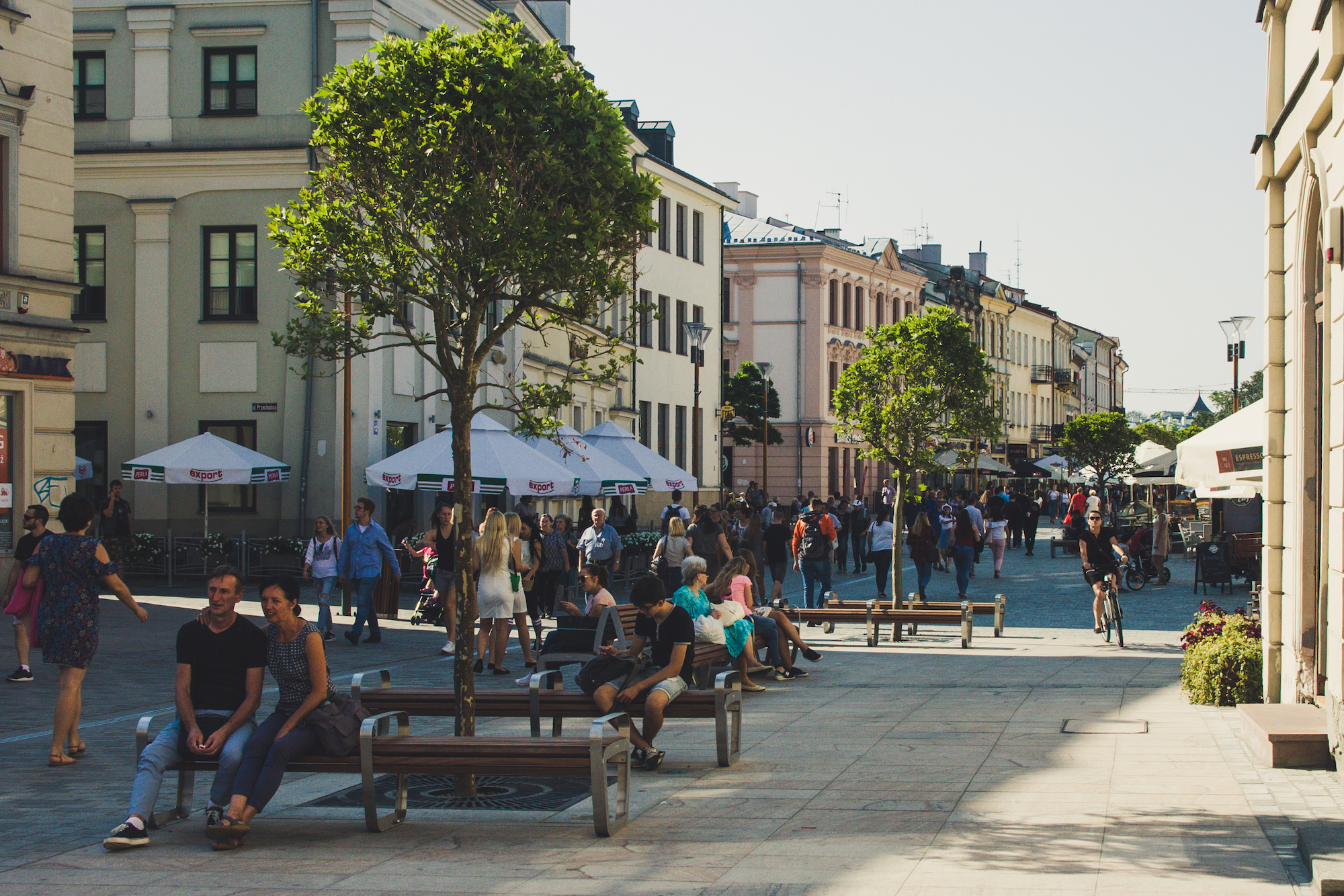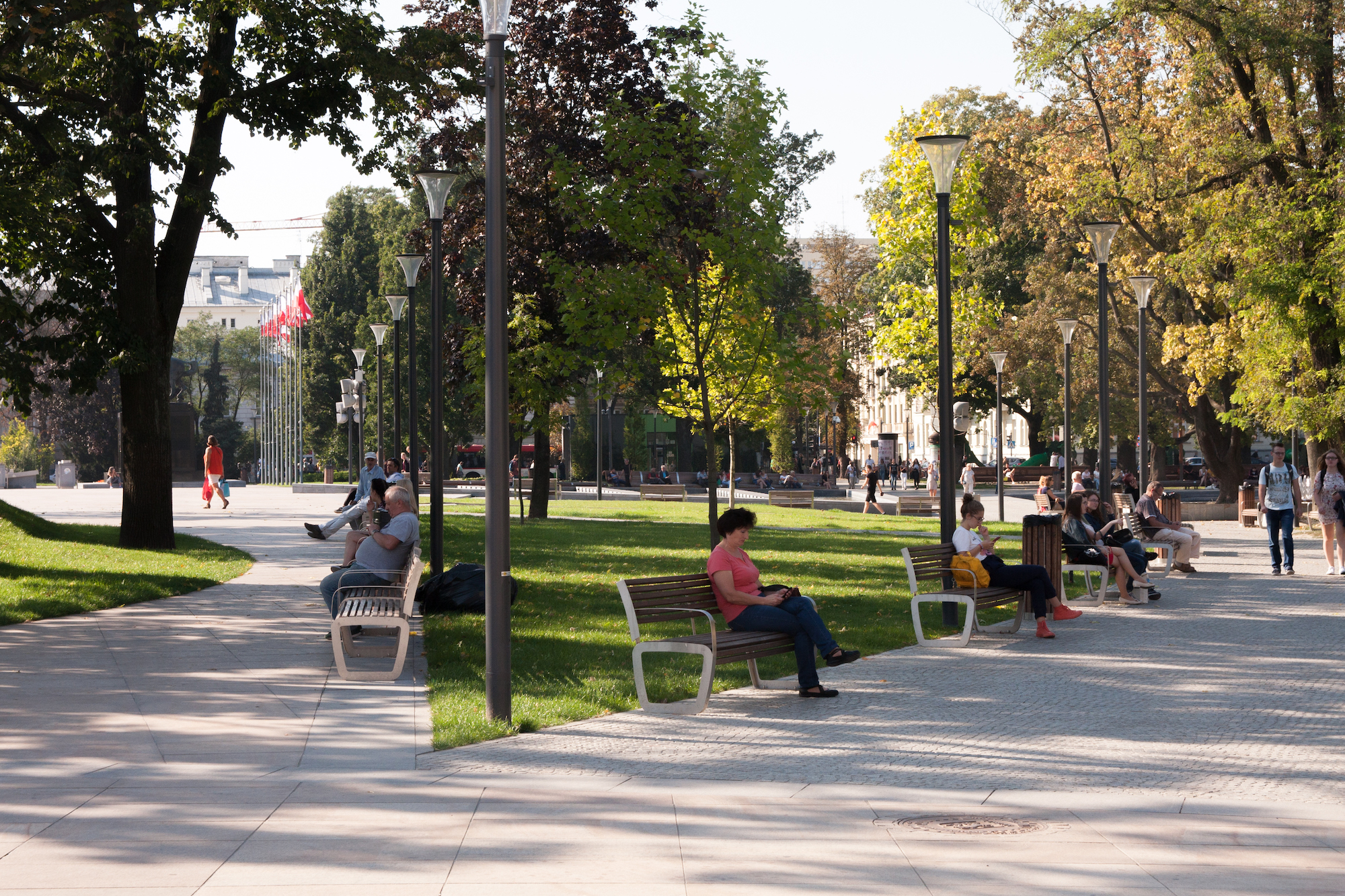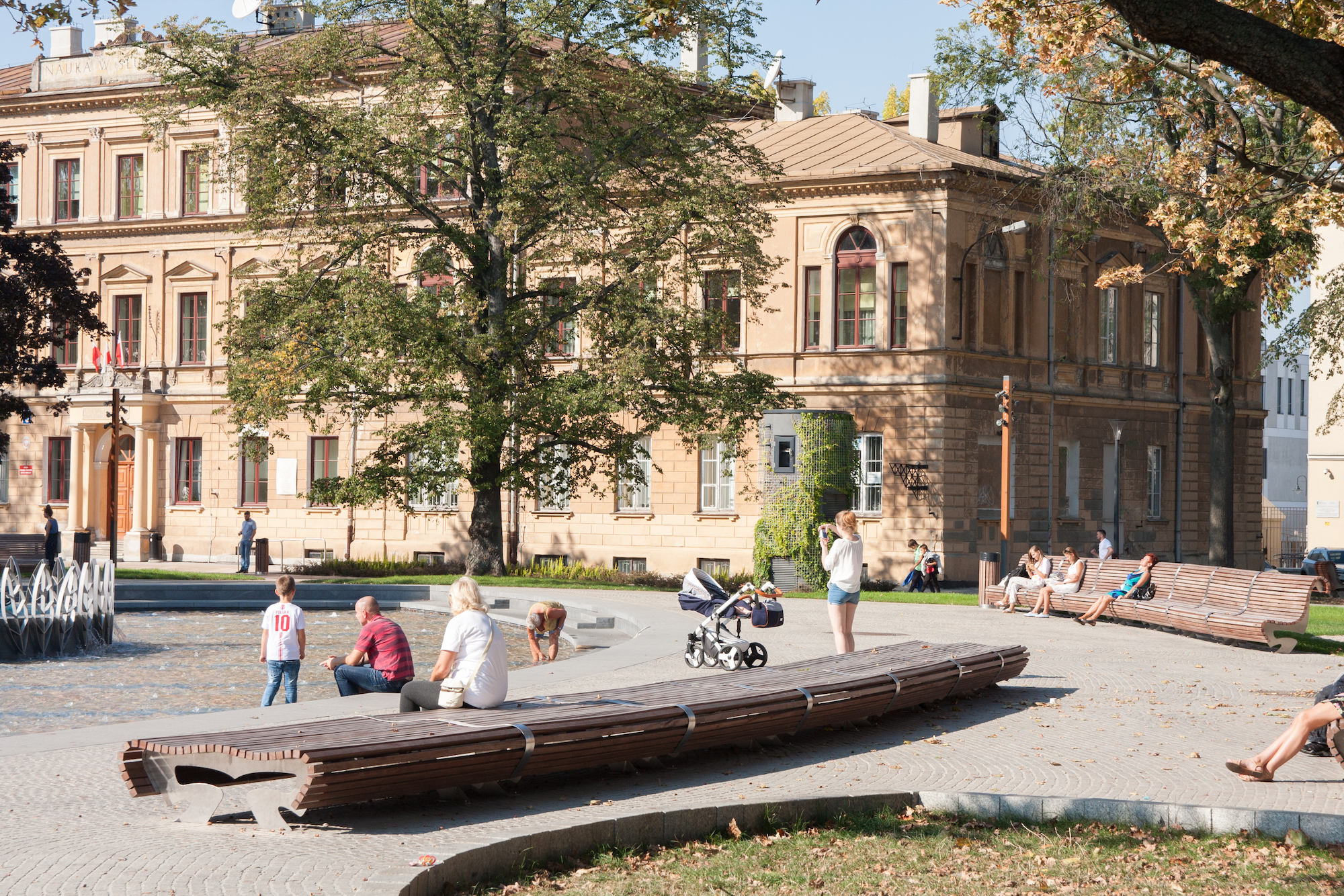 Elementy małej architektury pierwotnie miały być wykonane z drewna dębowego, które z uwagi na warunki fizyczne nie jest zalecane do zastosowania w przestrzeni publicznej. Dostarczone elementy wykonane zostały z lepszego gatunkowo drewna egzotycznego, które jest wyjątkowo odporne na warunki atmosferyczne i jest bardzo proste w utrzymaniu. Nawet bez konserwacji – jej brak powoduje jedynie pokrycie się drewna patyną, która je zabezpiecza. Wielu osobom taki efekt podoba się tak jak patyna na miedzi. Jednak, żeby drewno było wybarwione na konkretny kolor i w pełni zabezpieczone, wystarczy je raz w roku na zaolejować i możemy być spokojni, że będzie nam służyć przez długie lata, znacznie dłużej niż nasze rodzime gatunki.