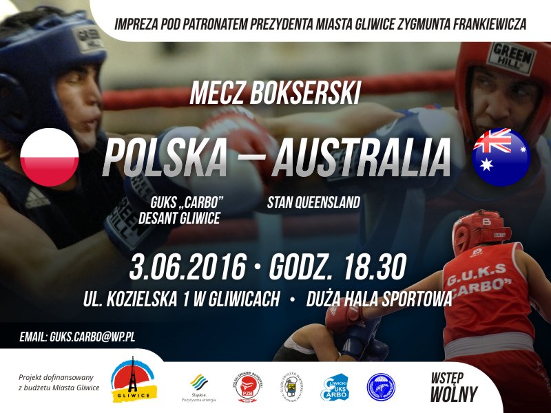 3 czerwca o godz. 18.30 w hali przy ul. Kozielskiej odbędzie się mecz bokserski Polska – Australia.