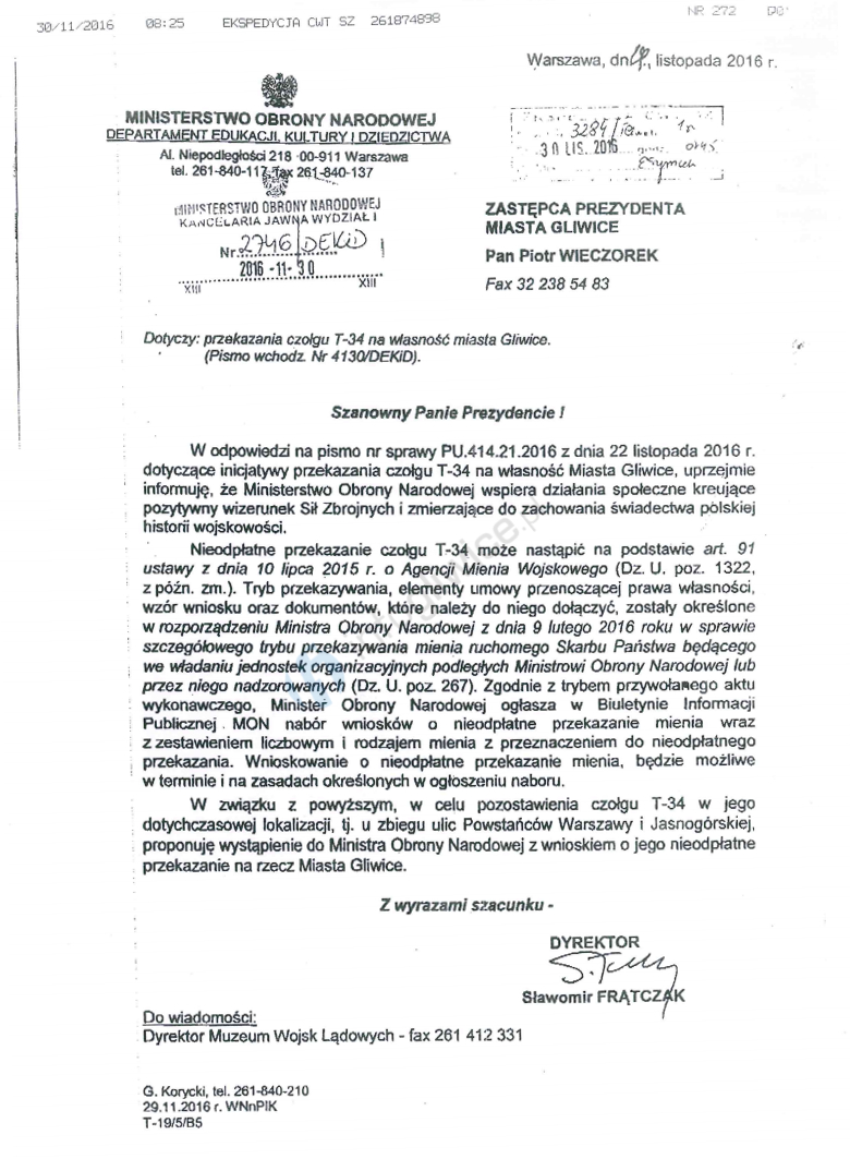 Dziś do naszej redakcji dotarło pismo, które MON wysłało do władz Gliwic. „MON wspiera działania społeczne kreujące pozytywny wizerunek Sił Zbrojnych i zmierzające do zachowania świadectwa polskiej historii wojskowości” – czytamy w piśmie. Może to oznaczać, że Ministerstwo chętnie przekaże czołg miastu Gliwice.