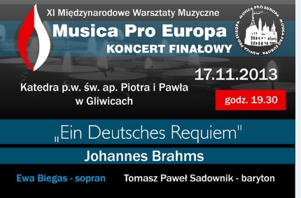 W ramach warsztatów odbędą się 2 koncerty. Koncert towarzyszący 16.11.2013 o godz. 18.00 w parafii w Bojkowie oraz koncert finałowy 17.11.2013 o godz. 19.30 w Katedrze w Gliwicach, na którym zostanie wykonane „Ein Deutsches Requiem” Johanesa Brahmsa. Utwór wykona orkiestra symfoniczna z Budapesztu oraz połączony chór: Bortniański z Ukrainy, Resonans con tutti z Zabrza oraz Akademicki Zespół Muzyczny z Gliwic. Szczegóły na plakatach.