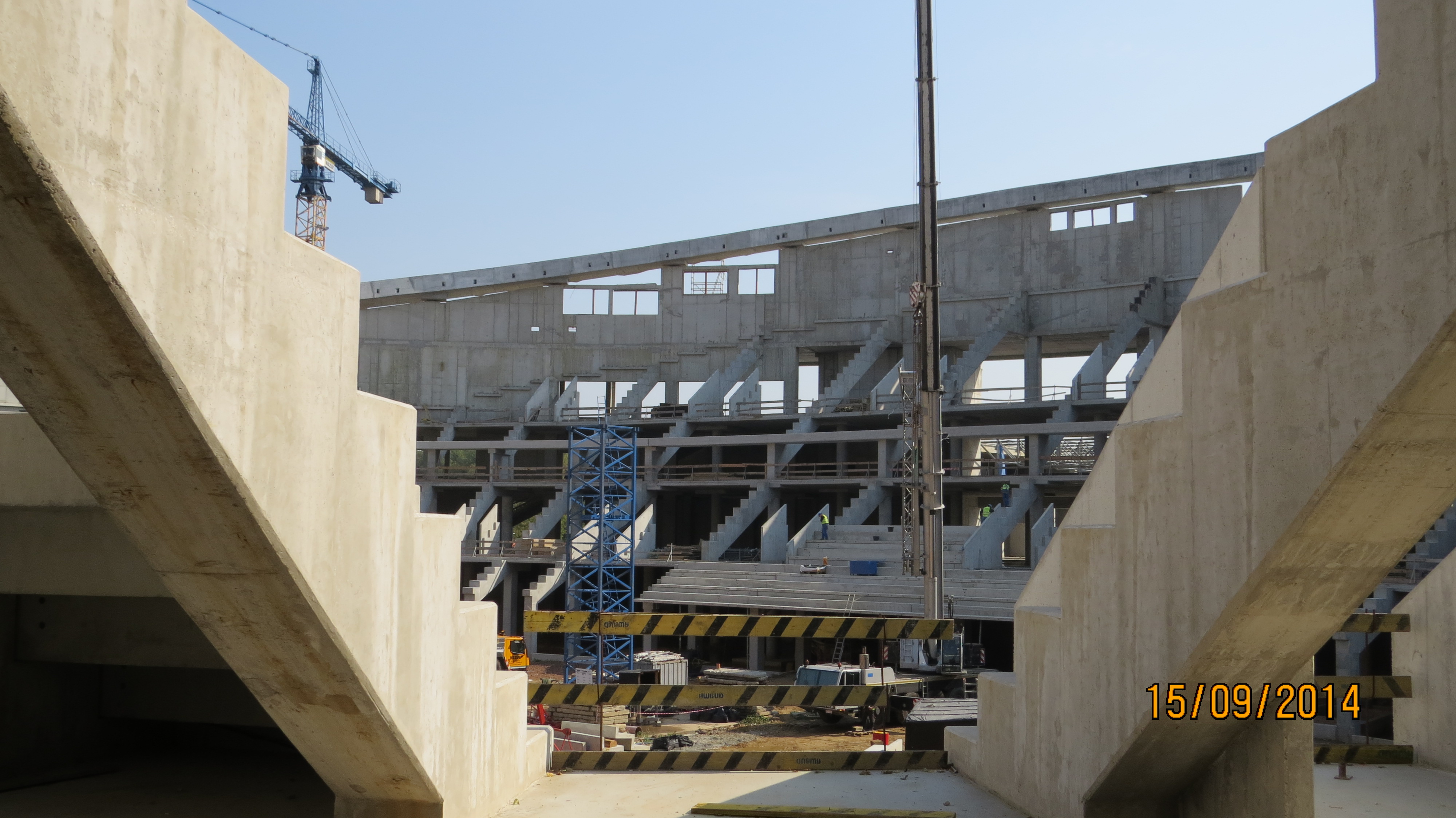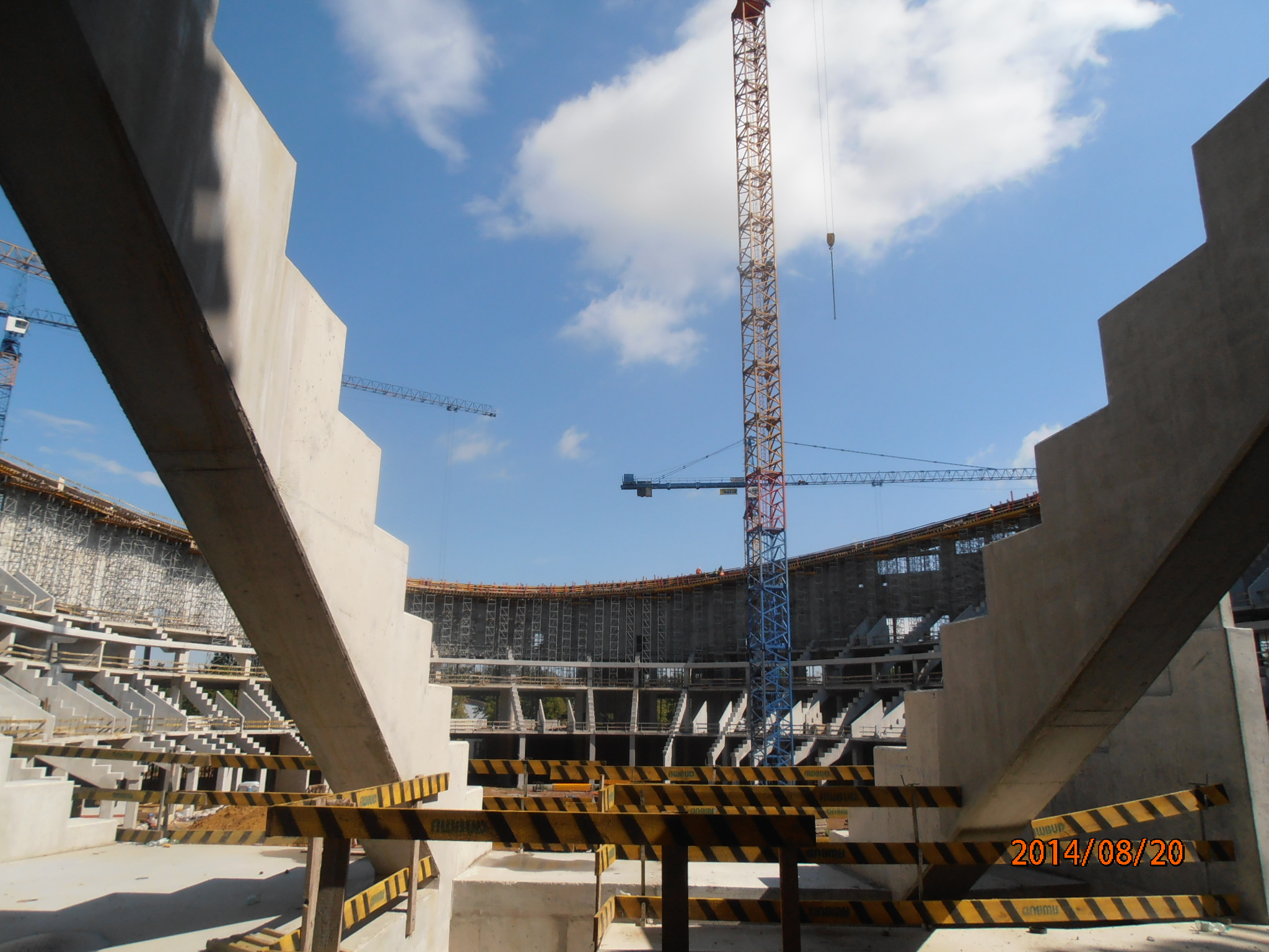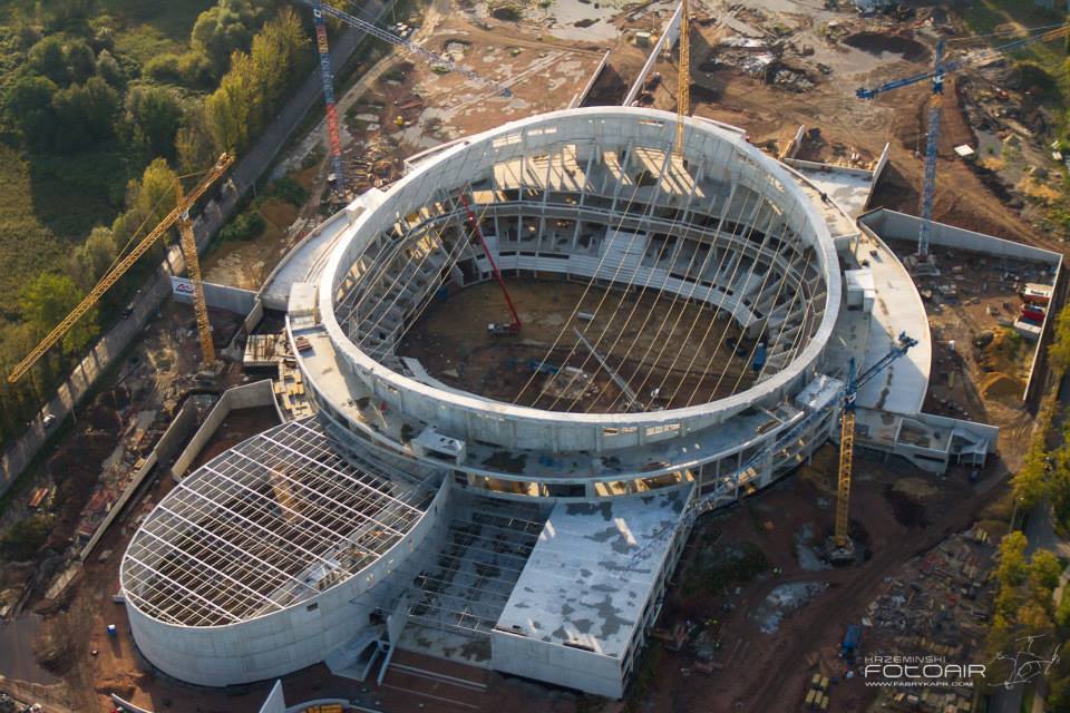 W hali głównej zakończono betonowanie ringu dachu. Rozpoczął się montaż stalowych cięgien ringu. Trwa również montaż trybun prefabrykowanych.