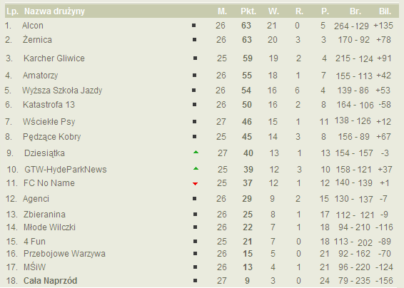 Po 27. kolejce Niedzielnej Ligi Futsalu zarówno w tabeli jak i w rankingu strzelców bez większych zmian.