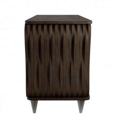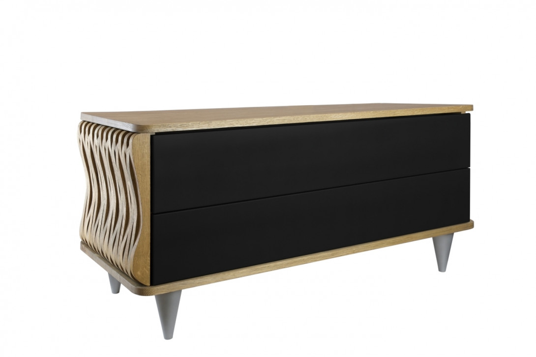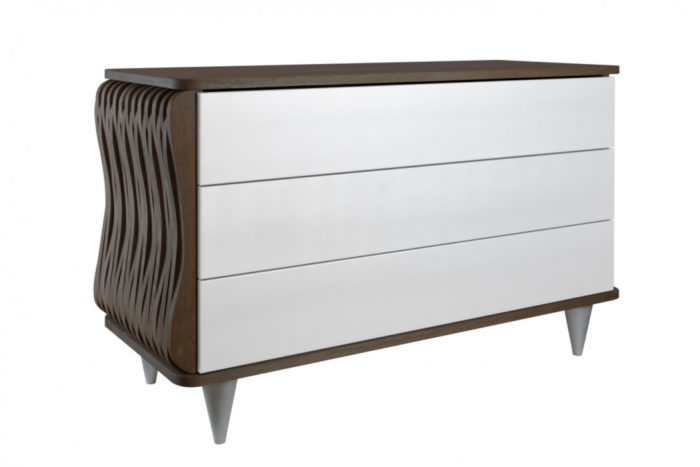 • w wersji ORGANIQUE, czyli nowoczesna komoda do sypialni, inspirowana naturą. Drewno z jednej strony uformowane w fale zostało ręcznie zabezpieczone. Pokrywająca je warstwa oleju sprawia, że uwydatnione są naturalne słoje, a kolorystyka mebla przywodzi na myśl skojarzenia z lasem. Białe akcenty w połączeniu z tym ekologicznym materiałem sprawiają, że komoda pasuje do wnętrz skandynawskich, rustykalnych, industrialnych i nie tylko, a przede wszystkim do wnętrz z charakterem.