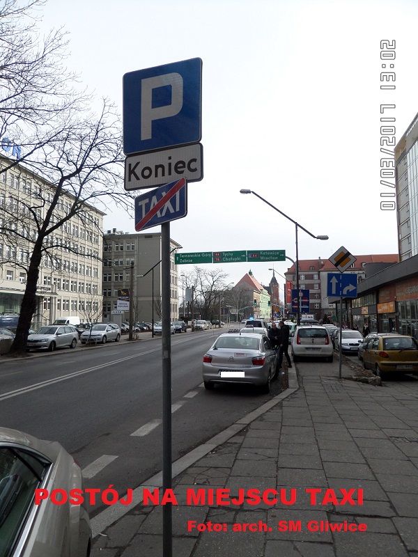 „postój na miejscu Taxi”. Przecież tam nie ma już postoju dla Taxi. Na zdjęciu wyraźnie widać skreślony znak Taxi, czyli za tym znakiem postoju taksówek już nie ma, a parkowanie jest legalne.