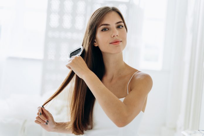 Brushing hair. Portrait of young woman brushing straight natural hair with comb. Waist up of girl combing beautiful long healthy hair with hairbrush. Hair care and beauty concept