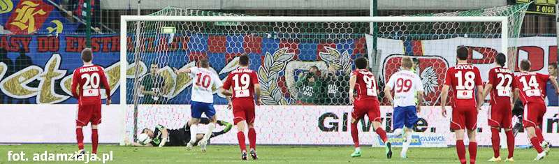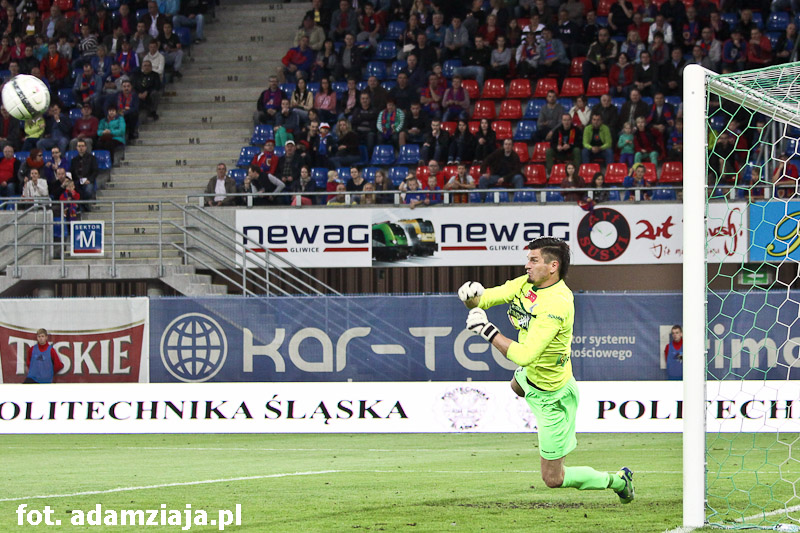 Chwilę później sędzia Garbowski podyktował rzut karny. Jedenastkę jednak pewnie wybronił Dariusz Trela, żegnając się z Gliwicami.