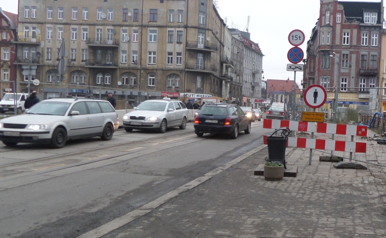 Na ul. Zwycięstwa na wysokości budowy Drogowej Trasy Średnicowej został ustawiony znak drogowy B-41 informujący o zakazie ruchu pieszych.