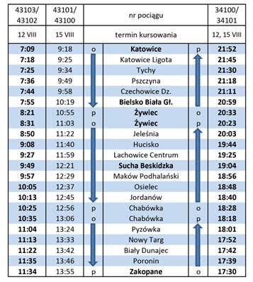 Pierwszy kurs z Katowic do Zakopanego wyruszy 12 sierpnia kilka minut po godzinie 7. Kolejny pociąg wyjedzie do stolicy polskich Tatr 15 sierpnia o 9:18. Pociągi powrotne w oba te dni wyjadą z Zakopanego o godzinie 17:30, dzięki czemu do Katowic będzie można wrócić kilka minut przed 22. Szczegółowy rozkład jazdy pociągów specjalnych można znaleźć w tabeli poniżej: