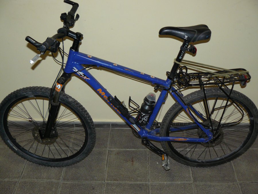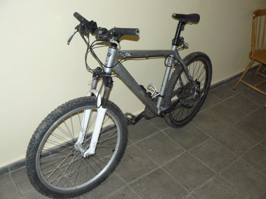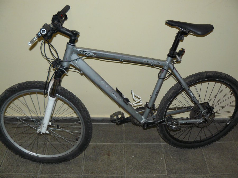 1. Rower granatowy. Ustalono, że jego marka to Giant. Z dużym prawdopodobieństwem oryginalnie był koloru srebrnego. Posiada przerzutki marki Shimano Alivio.