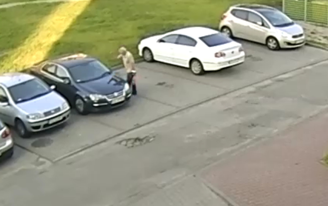 Mężczyzna, którego wizerunek widoczny jest na nagraniu, po podejściu do przedniej szyby zaparkowanego pojazdu uderzył w nią pięścią, powodując jej uszkodzenie.