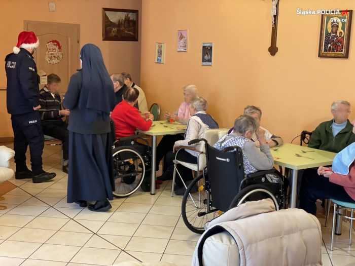 Pensjonariusze placówki, którzy są sprawni ruchowo, na normalnych zasadach uczestniczą w życiu społecznym, wychodzą na zewnątrz, odwiedzają znajomych, a jako piesi są także uczestnikami ruchu drogowego – stąd przypomnienie zasad bezpieczeństwa podczas poruszania się po chodnikach i przechodzenia przez jezdnię. Omówiono także inne zagrożenia, na jakie narażeni są seniorzy, a każdy uczestnik spotkania (w tym prowadzące placówkę siostry zakonne oraz personel) otrzymał od policyjnego Mikołaja upominek w postaci elementu odblaskowego i… zdrowej przekąski.