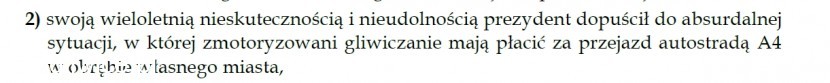 Chodzi o informację dotyczącą opłat na autostradzie A4, którą podawali referendyści. W materiałach promocyjnych OKR znalazło się stwierdzenie „swoją wieloletnią nieskutecznością i nieudolnością prezydent dopuścił do absurdalnej sytuacji, w której zmotoryzowani gliwiczanie mają płacić za przejazd autostradą A4 w obrębie własnego miasta”. Zygmunt Frankiewicz postanowił udowodnić przed sądem, że to nieprawda. I udowodnił. – Rozprawa się zakończyła. Wyrok: OKR ma przeprosić prezydenta Gliwic – mówi Marek Jarzębowski, rzecznik prezydenta Frankiewicza.