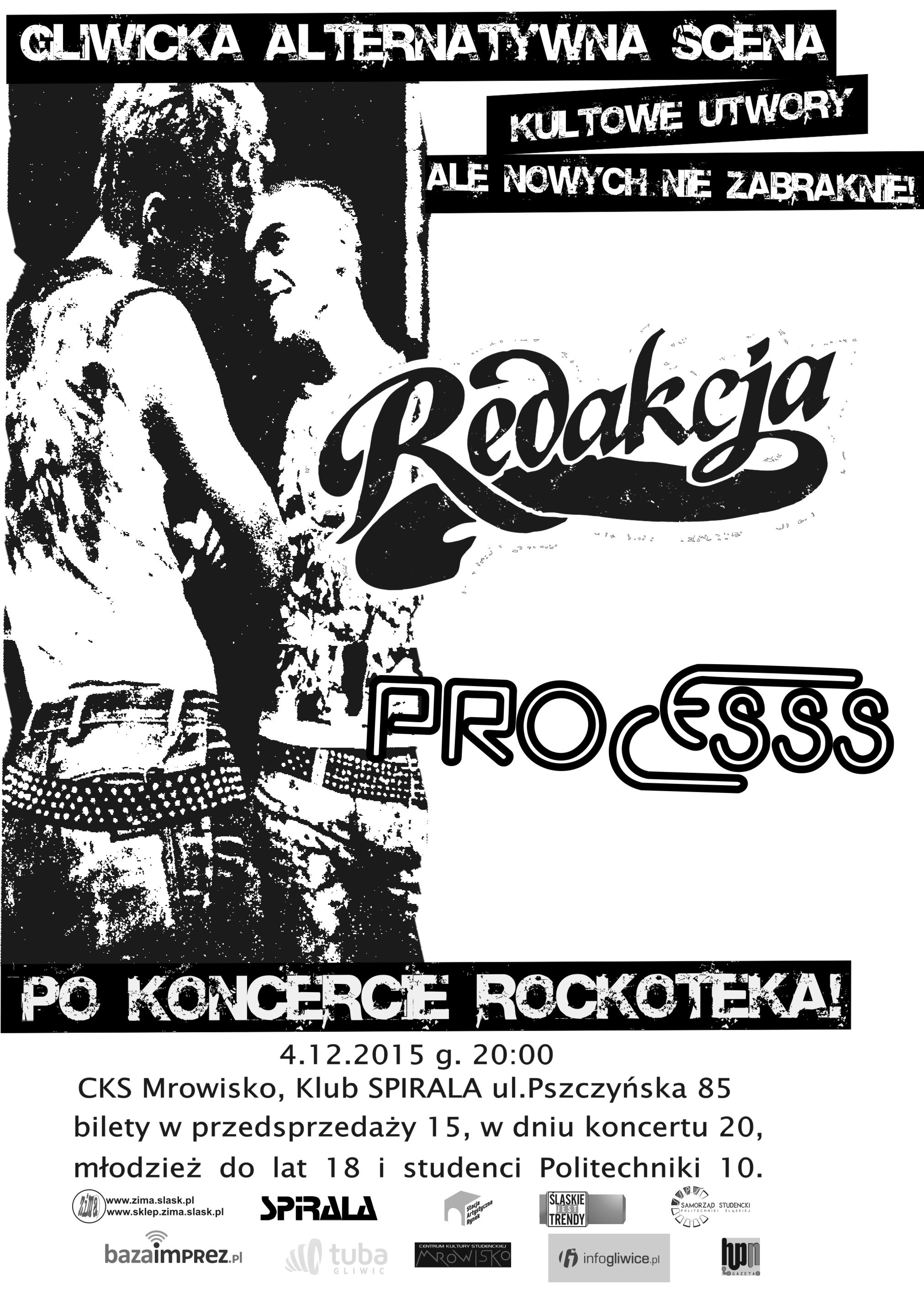 4 grudnia w klubie Spirala przy ul. Pszczyńskiej 85 koncert zespołów Process i Redakcja. Start o 20:00, bilety 15/20 (młodzież do lat 18 i studenci Politechniki Ślaskiej 10 zł).