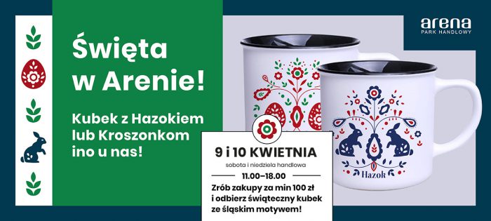 Hazok czyli wielkanocny zajączek to jeden z najbardziej śląskich zwyczajów wpisanych w święta. Zatem niech tradycji stanie się zadość! Każdy kto w sobotę lub niedzielę (9 i 10 kwietnia) w godz. 11.00 – 18.00 zrobi u nas zakupy za minimum 100 złotych – otrzyma hazoka od Areny, czyli świąteczny kubek z motywem właśnie śląskiego zajączka lub wzoru naszej pisanki zwanej kroszonkom. Mamy nadzieję, że świąteczna kawa z tradycyjnym motywem będzie smakowała wybornie!