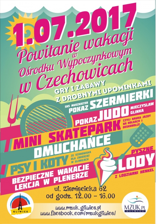 Z okazji otwarcia sezonu letniego Miejski Zarząd Usług Komunalnych organizuje dla wszystkich mieszkańców Gliwic i okolic coś specjalnego. Oficjalne „Powitanie wakacji”, które odbędzie się 1 lipca w Czechowicach w godzinach 12:00 – 16:00. Każdy znajdzie coś dla siebie! Od dmuchawców przez pokazy judo i szermierki, gry i zabawy oraz lekcja bezpieczne wakacje, znakowanie rowerów i animacje dla dzieci. Pyszne lody, słodka wata cukrowa i uwielbiany popcorn. Tego dnia nikt nie będzie się nudził. Zachęcamy do udziału w grach i zabawach organizowanych m.in. przez Miejską Bibliotekę Publiczną i Straż Miejską. Dla zwycięzców przewidujemy nagrody i upominki. Pokazy szermierki zorganizowane przez klub sportowy Muszkieter i pokaz judo w wykonaniu Mieczysława Glinki, zapewne zachwycą wszystkich sportowców. Może znajdą się jakieś nowe, nie odkryte dotąd talenty? Bańki mydlane, malowanie twarzy i wiele innych ciekawych animacji czekać będzie na najmłodszych.