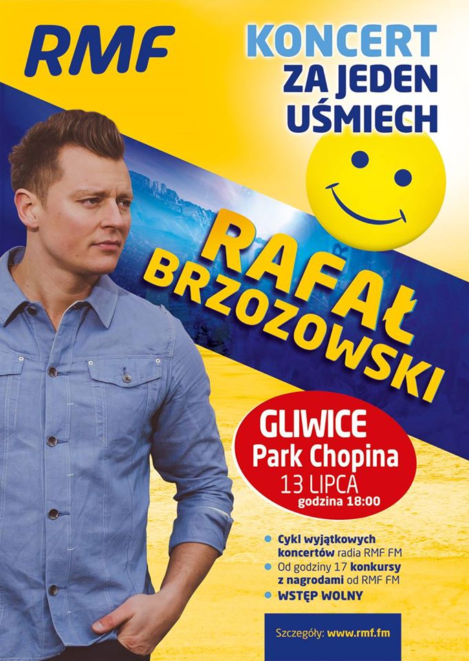 GliwiceWydarzenia Rafał Brzozowski zaśpiewa dziś w Gliwicach. Wstęp wolny 13 lipca 2016 FacebookTwitterEmail rafal Rafał Brzozowski zaśpiewa 13 lipca w Gliwicach. Koncert w Parku Chopina rozpocznie się o godz. 18.00. Wstęp wolny. Drugi z serii „Koncertów za jeden uśmiech”, organizowanych przez RMF FM, już dziś w Gliwicach. Jego gwiazdą będzie Rafał Brzozowski.