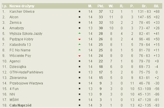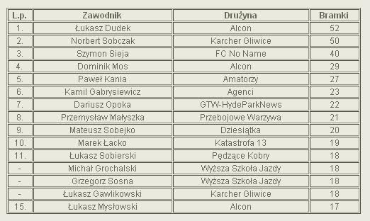 Na tym etapie , po 15. kolejkach liderem rozgrywek jest Karcher Gliwice, a wiceliderem Alcon. Na trzeciej pozycji utrzymuje się Żernica. W rankingu najlepszych strzelców prowadzi Łukasz Dudek z drużyny Alcon, a najmniej straconych bramek ma Kuba Ogan, bramkarz Wyższej Szkoły Jazdy.