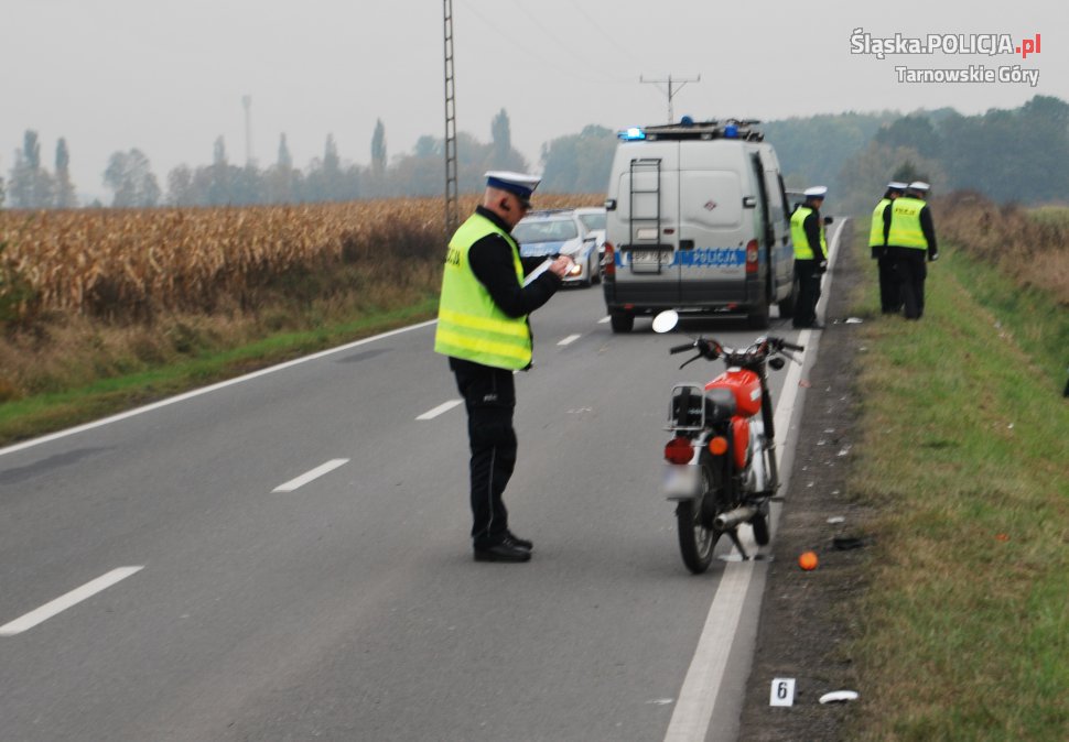W zderzeniu samochodu osobowego z motorowerzystą zginął 44-letni kierowca jednośladu. Dokładne okoliczności i przyczyny wypadku wyjaśniają śledczy.