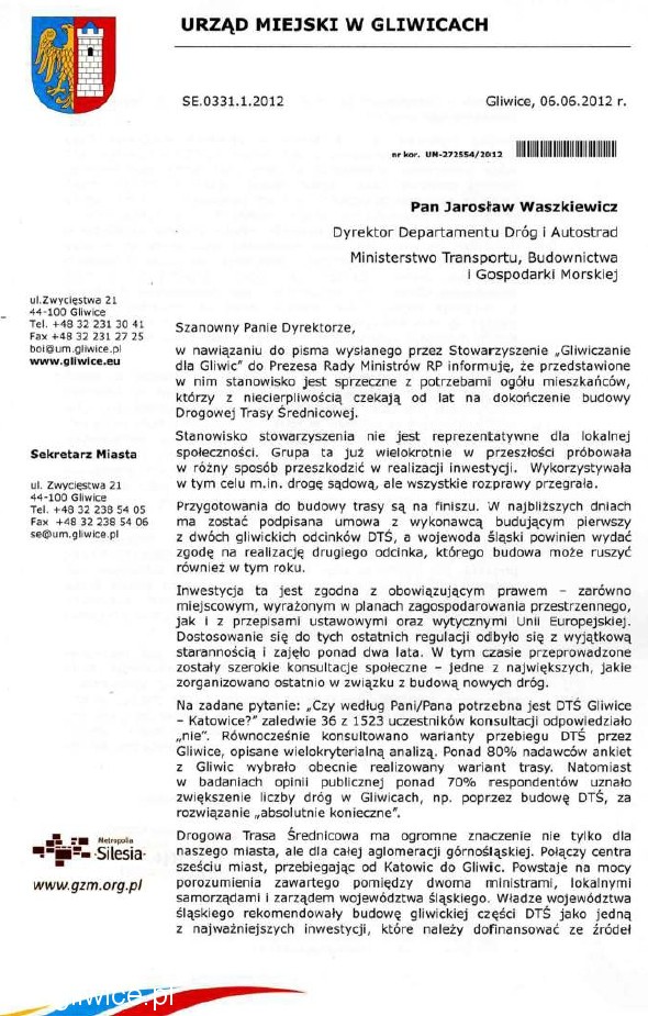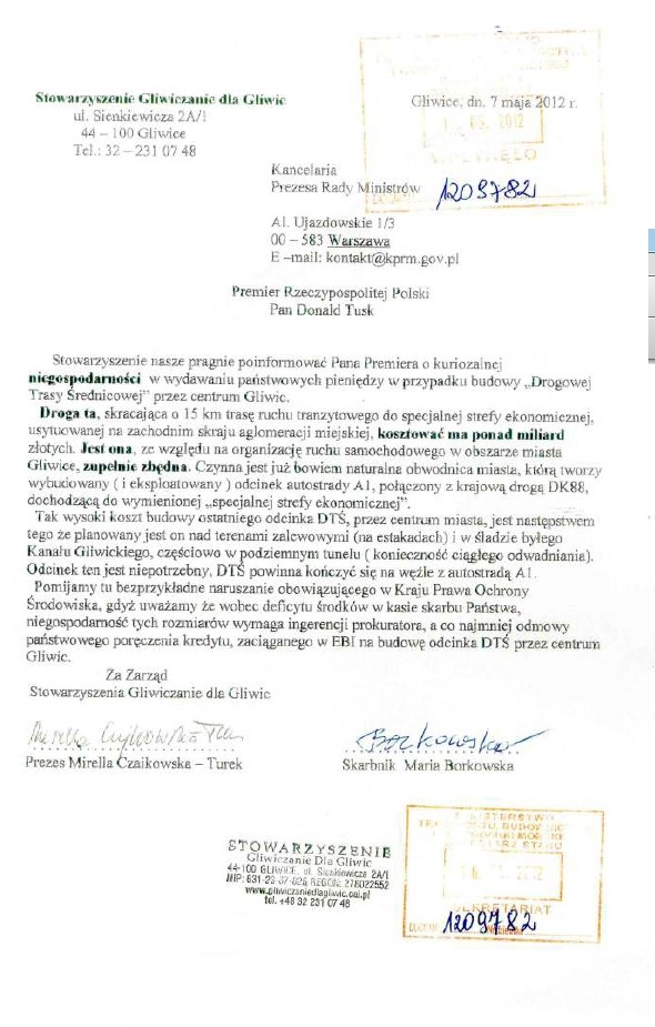 Lada dzień ma zostać podpisana umowa z wykonawcą budującym pierwszy z dwóch gliwickich odcinków trasy, a wojewoda śląski powinien wydać zgodę na realizację drugiego odcinka. Tymczasem stowarzyszenie „Gliwiczanie dla Gliwic” po raz kolejny próbuje zablokować tę inwestycję. – Napisano list do premiera Tuska, zawierający nieprawdziwe informacje i pomówienia – mówi Marek Jarzębowski, rzecznik prezydenta Gliwic.