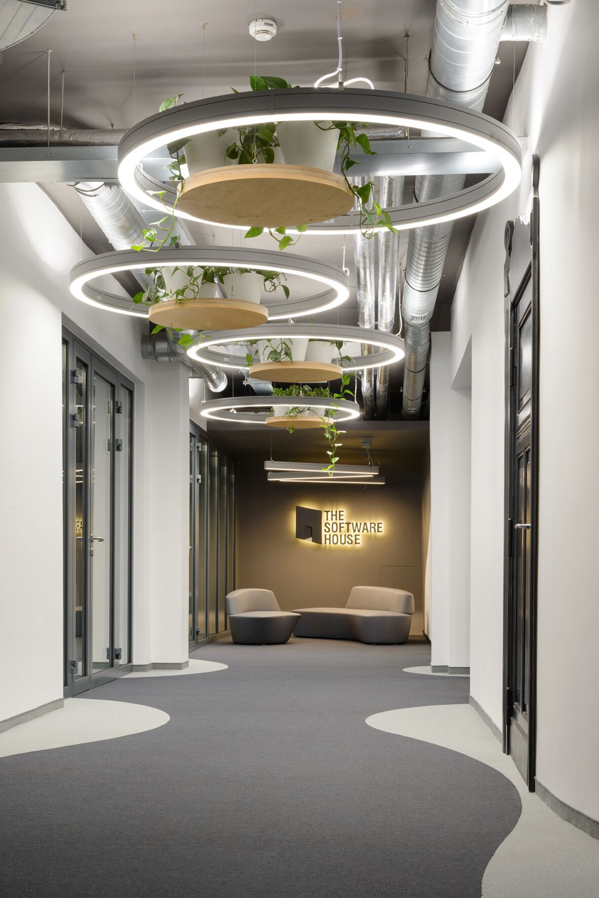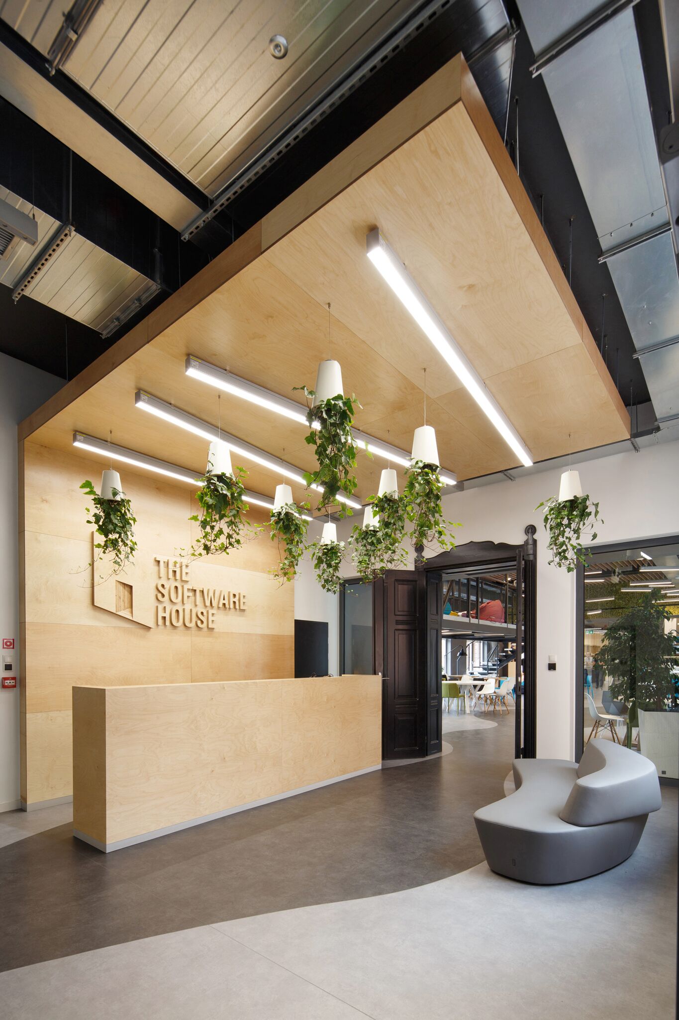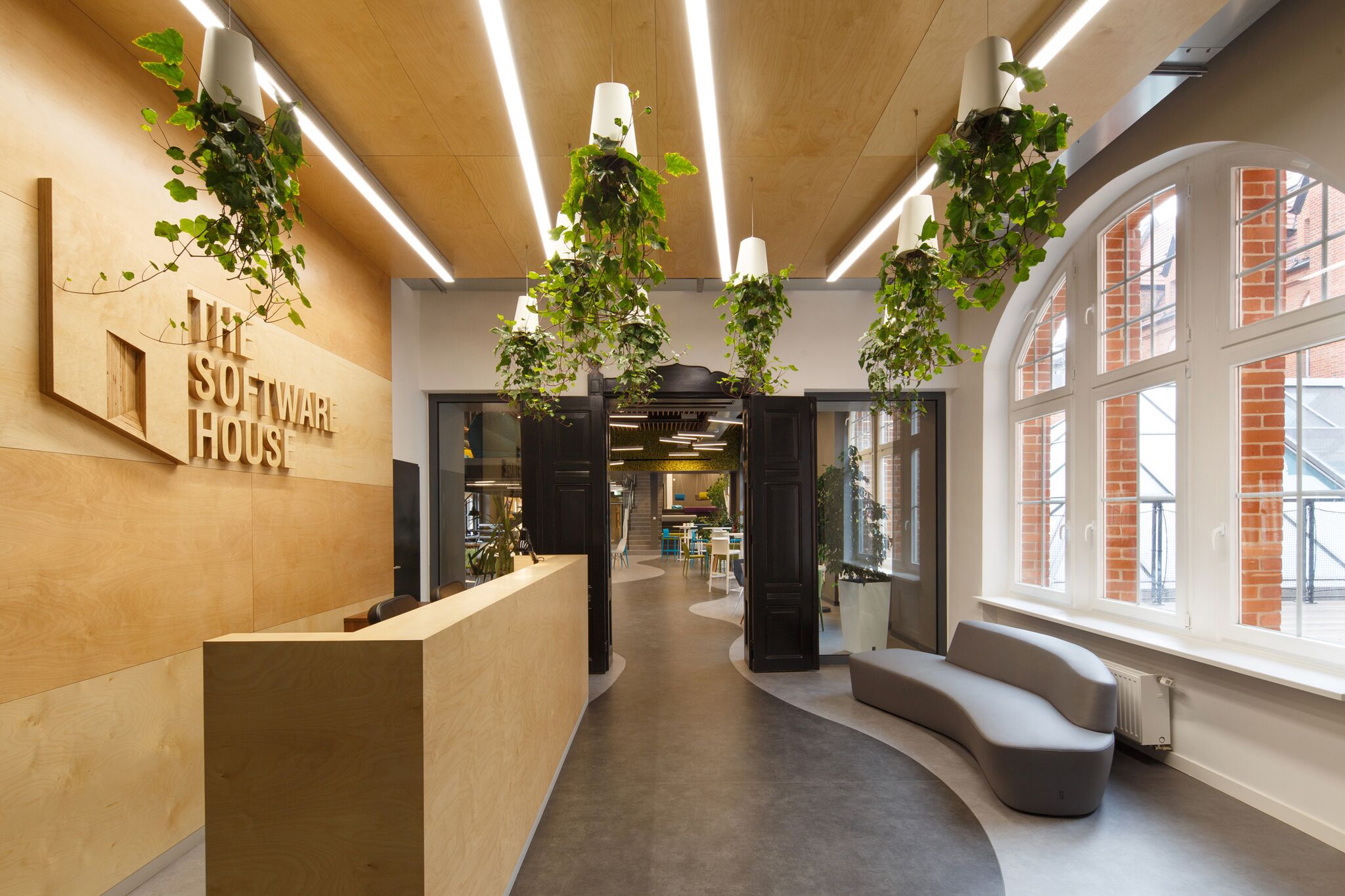 The Software House wypełnia żywa zieleń, wkomponowana w regały, pnąca się po ścianach, wisząca na specjalnych podestach nad głowami. To nie tylko kwestia estetyki, ale także dążenie do stworzenia najlepszych warunków do pracy. Szczególnie pracy intelektualnej, w której najbardziej obciążony jest mózg. A rośliny dostarczając mu tlen, zwiększają produktywność. Poza tym specyfiką obecnych czasów jest zacieranie się granic pomiędzy typową wizją pracy i rekreacji. Coraz częściej swobodna,prawie towarzyska rozmowa staje się przyczynkiem do powstania oryginalnego projektu czy źródłem stworzenia nowych, wyjątkowych rozwiązań technologicznych lub informatycznych. Architektura uwzględnia te zmiany, tworząc udomowione przestrzenie do pracy. Parafrazując określenie homeoffice można powiedzieć, że są to „office jak home”. Stąd zieleń, miejsca do rekreacji, otwarte przestrzenie, umożliwiające jednocześnie skupienie. -Architektura biura to „język”, którym mówi marka. Powiemy, że biuro jest wizytówką firmy -pierwszym wrażeniem, jakiego doznaje klient oraz pracownik, który także do pewnego stopnia jest… klientem. Nie mniej ważne jest drugie wrażenie, czyli -jak przestrzeń biurowa sprzyja pracy, dobrej atmosferze, jak wyraża filozofię i wartości firmy. Ta rozmowa prowadzona jest za pośrednictwem architektury – mówi Krzysztof Zalewski, właściciel Zalewski Architecture Group – A słowa te mają swoje odzwierciedlenie w nowej siedzibie Software House w budynku starej poczty w Gliwicach.