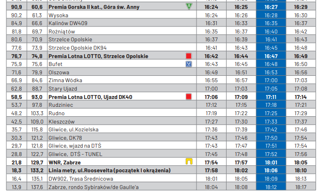 Przejazd peletonu przewidziany jest na godzinę około 17:12 (DK 40 wjazd do Rudzinca) a opuszczenie powiatu gliwickiego (DW 902- Drogowa Trasa Średnicowa w kierunku Zabrza) planowane jest około godziny 17:50. Po przejechaniu wyścigu ruch na zamkniętych odcinkach zostanie wznowiony.