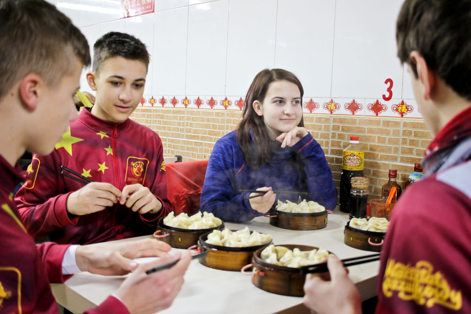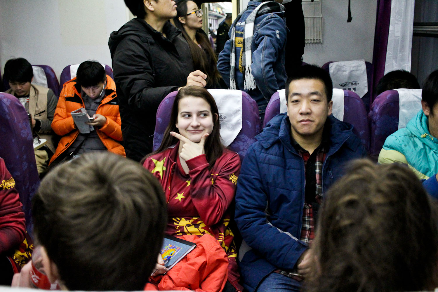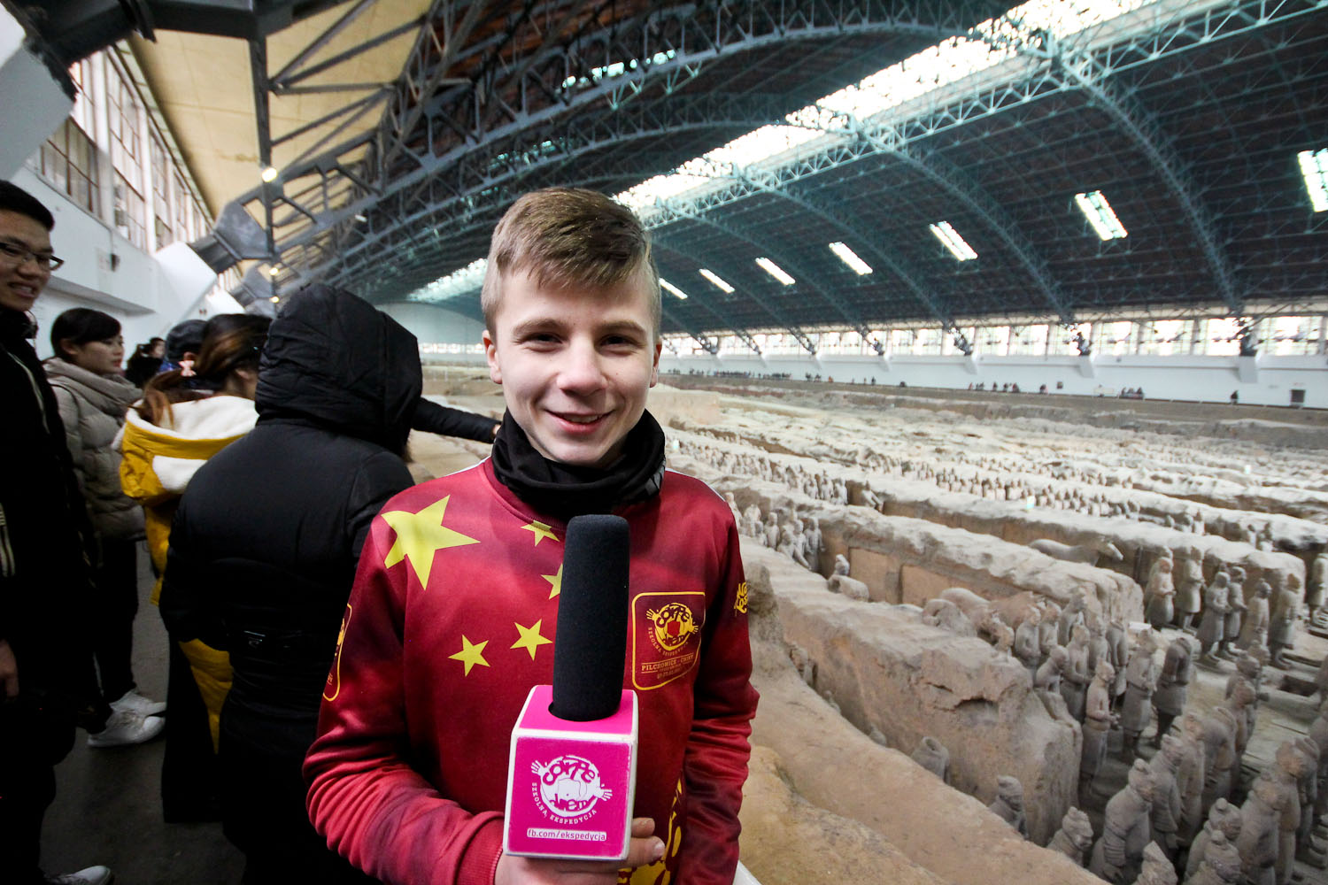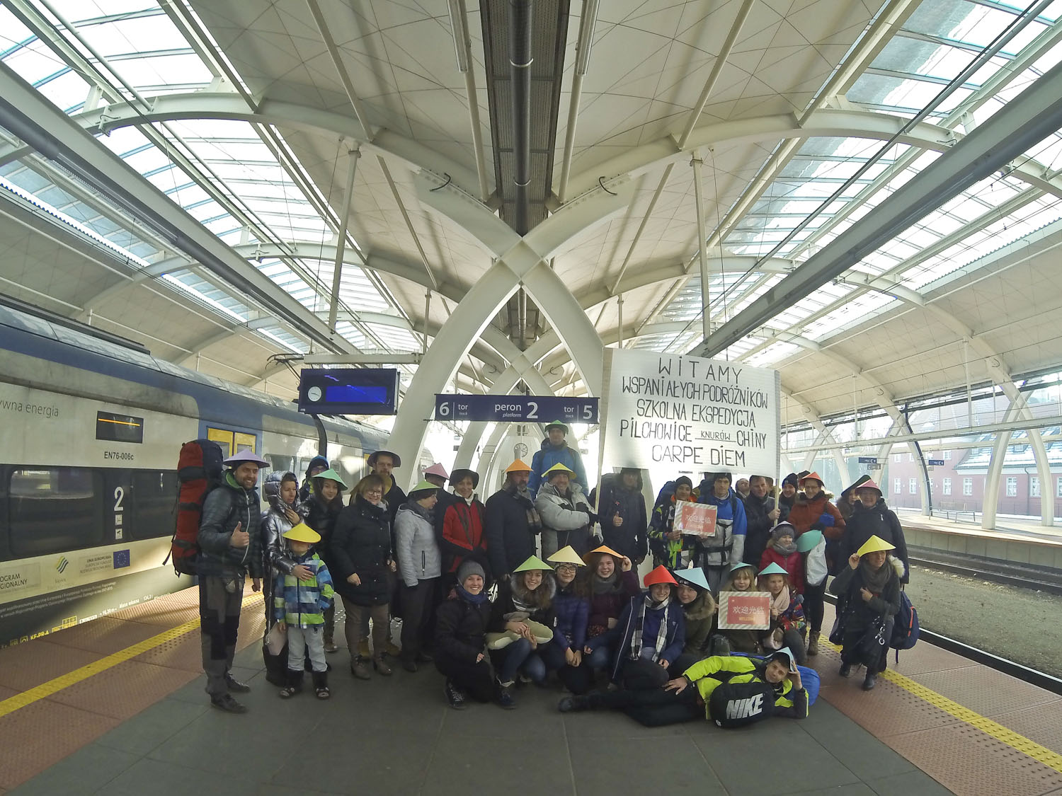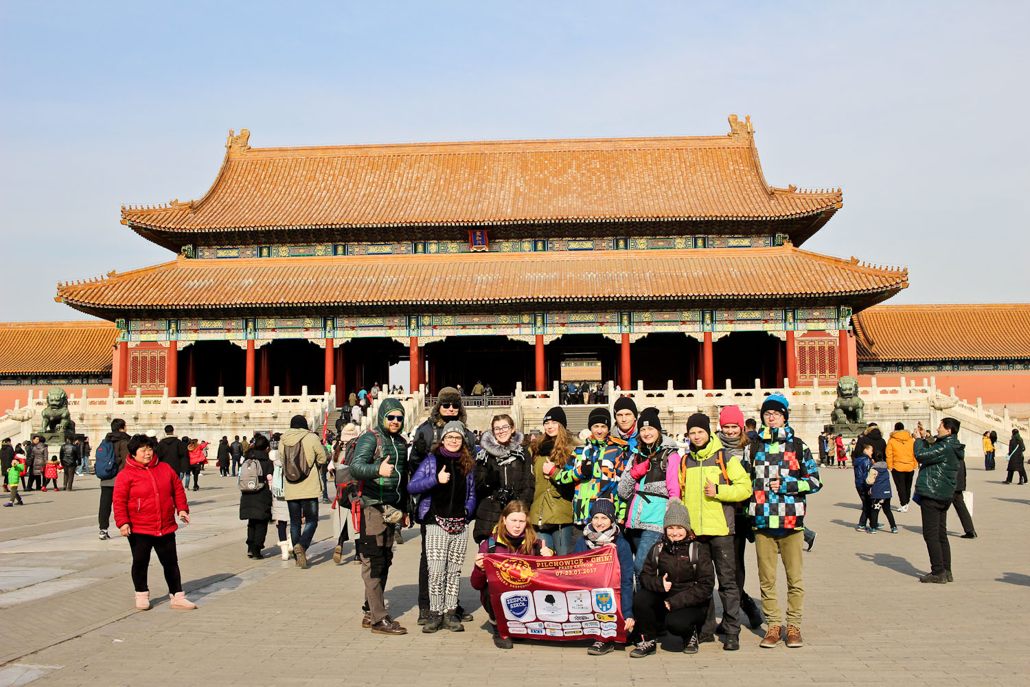 „Tym razem odwiedziliśmy Chiny. Nasza przygoda rozpoczęła się na dworcu w Katowicach. Co prawda opóźnieniem, ale zostaliśmy dobrej myśli. W pociągu niektórym udało się jeszcze zasnąć, a pozostali śpiewali albo w inny sposób starali się umilić sobie czas jazdy. Na dworcu w Warszawie przywitała nas pani Małgorzata Surdel – nauczycielka języka niemieckiego w Zespole Szkół w Pilchowicach – z nadzieją, że ktoś ma jeszcze dla niej miejsce w plecaku. Gdy byliśmy już na zewnątrz, czekaliśmy na autobus, którym dotarliśmy na Lotnisko Chopina. Przy odprawie nie było żadnych problemów i po krótkim czasie nadszedł moment, by wsiąść do samolotu. Lot był bardzo spokojny i wszyscy pozwoliliśmy sobie na drzemkę po nieprzespanej nocy. Wkrótce wylądowaliśmy w Amsterdamie. Przejście z jednego miejsca na drugie wymagało trochę czasu. Przed następnym lotem mieliśmy przerwę, więc uznaliśmy, że jeszcze się przejdziemy po lotnisku, gdyż czekała nas długa podróż do Pekinu. Rozpoczynał się dla nas już drugi dzień, a co niektórzy bardzo mało spali. Po dziesięciu godzinach szczęśliwie wylądowaliśmy, lecz nasza droga jeszcze się nie kończyła. Busem dojechaliśmy na dworzec, aby zakupić bilety na pociąg. Następnie poszliśmy coś zjeść. Było to dla nas ogromnym wyzwaniem, bo musieliśmy się nauczyć jak prawidłowo trzymać pałeczki. Na szczęście ludzie, którzy siedzieli przy stole obok, trochę nas podszkolili. Wieczorem wyjechaliśmy ze stolicy. W pociągu poznaliśmy miłego chińczyka. Nie potrafił posługiwać się językiem angielskim, dlatego porozumiewaliśmy się przez translatora. Dowiedzieliśmy się, że rysuje karykatury i pochwalił nam się zdjęciami i obrazami, które miał przy sobie. Byliśmy zafascynowani.