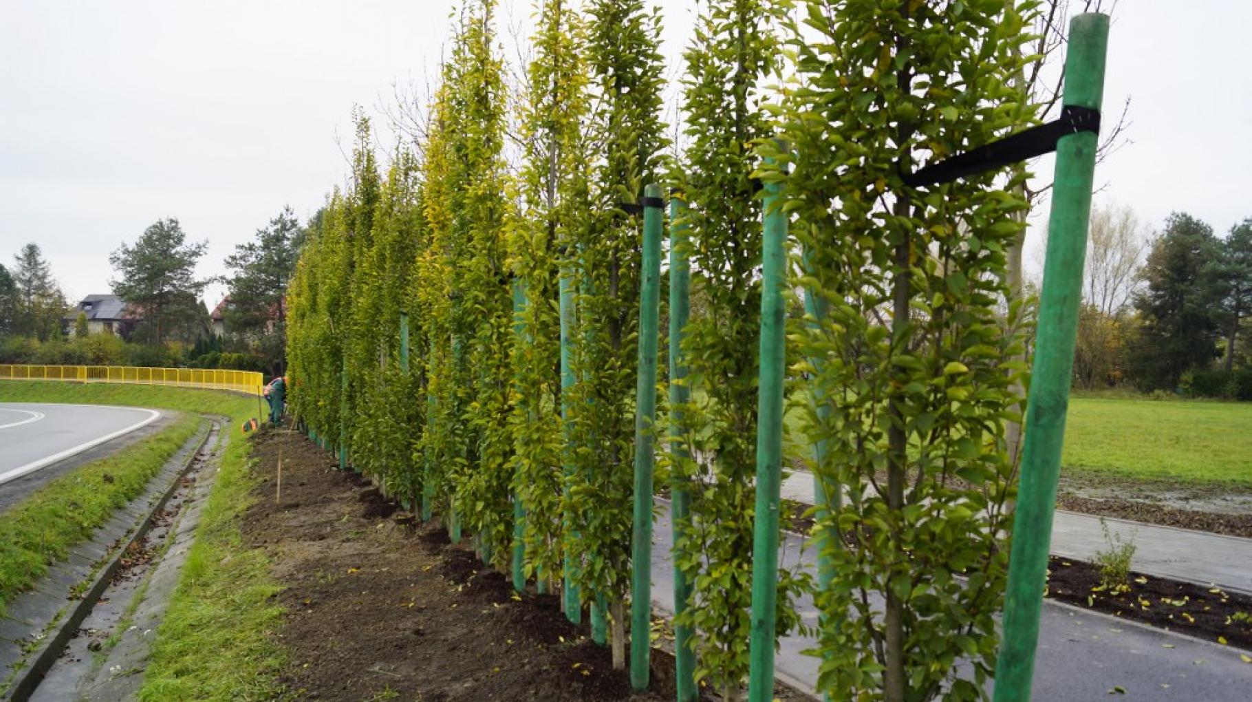 Pierwsze drzewa, w ramach zielonych ekranów, nasadzono dziś na zjeździe z ul. Tarnogórskiej w kierunku DK88.