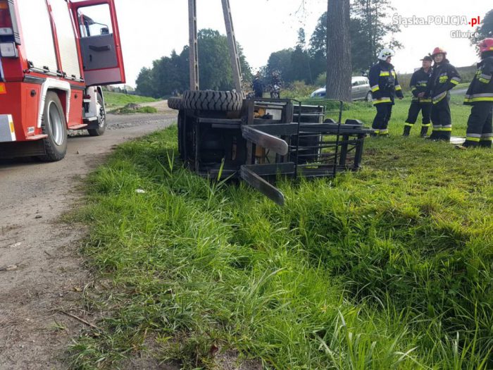 Policjanci ustalają okoliczności wypadku, do jakiego dziś rano doszło w Łanach Wielkich koło Sośnicowic. Wszystko wskazuje, że kierujący wózkiem widłowym mężczyzna stracił panowanie nad maszyną i wtedy wjechał do rowu – został przygnieciony.