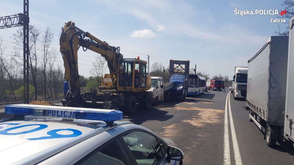Do wypadku drogowego doszło w środę około 11.00 na 27 km w kierunku Bytomia. Ze wstępnych ustaleń wynika, że 66-letni kierowca autobusu, w wyniku niezachowania należytej ostrożności, uderzył w oznakowany naczepą pojazd obsługi technicznej marki fiat doblo. Ten następnie uderzył w stojącego przed nim volkswagena, w wyniku czego volkswagen uderzył w stojącą przed nim koparkę. W zaparkowanych pojazdach nie było żadnych osób. W wyniku zderzenia kierowca oraz jedna pasażerka autobusu z niegroźnym urazami, w stanie przytomnym zostali przewiezieni do szpitala. Kierowca autobusu był trzeźwy.